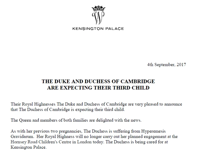 „Őfelségük Cambridge hercege és hercegnéje boldogan bejelenti, hogy a cambridge-i hercegné harmadik gyermekével várandós. A királynő és mindkét család tagjai nagyon örülnek a hírnek. Az előző két terhességéhez hasonlóan a hercegné továbbra is Hyperemesis gravidarum betegségben szenved. A hercegné nem fogja teljesíteni a mai napra tervezett Hornsey Road’s Children Centre látogatását Londonban. A hercegnét a Kensington Palotában ápolják” – írja a hivatalos közlemény.