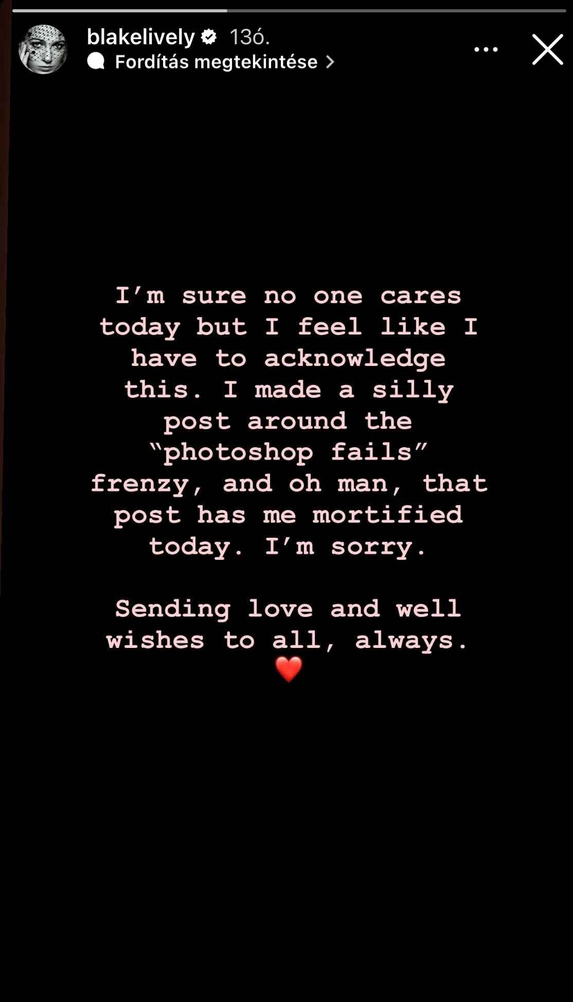 „Biztos vagyok benne, hogy ma ez senkit sem érdekel, de úgy érzem, hogy ezt be kell látnom. Készítettem egy buta posztot a Photoshop-botrány mizériára reagálva, és atyám, nagyon megaláztam magamat ezzel. Bocsánatot szeretnék kérni. Szeretetet és jókívánságokat küldök mindenkinek, mindig” - írta Blake Lively az Instagramon. Ezt követően a színésznő a szóban forgó reklámvideót eltávolította.