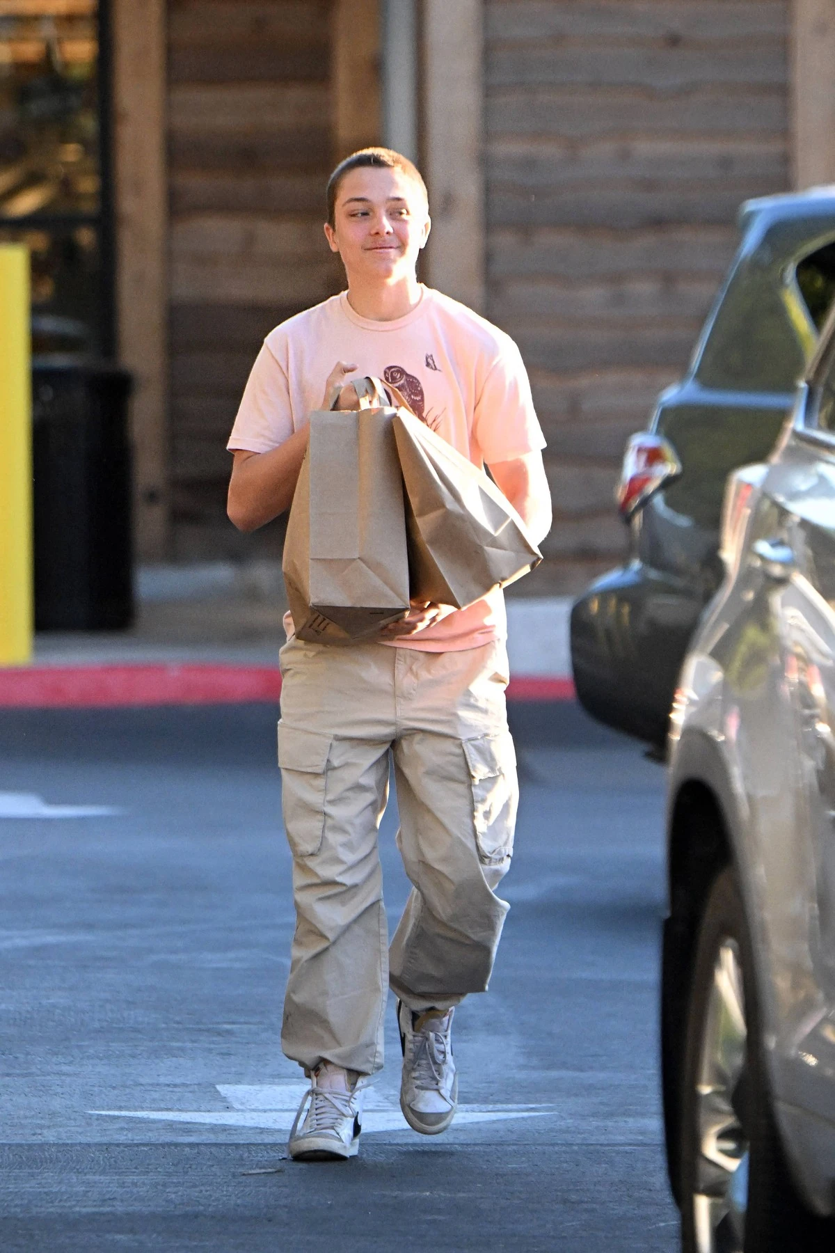 Knox egy rózsaszín, feliratos pólót viselt, amelyet krémszínű cargo nadrággal párosított, ez az összeállítás egyébként egy olyan stílus, amely a kilencvenes évek után a Z generáció körében ismét népszerűvé vált. A szettet klasszikus Nike magas szárú cipők tették teljessé, sportos élt adva az összeállításnak. A rövidre nyírt hajú 16 éves tini visszafogott stílusa feltűnően hasonlít apjáéra, hiszen Brad Pitt mindig is híres volt az erőlködésmentes, laza öltözködéséről.