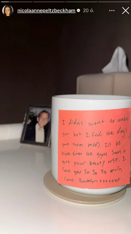 A fotón egy fehér bögre látható, rajta egy élénk narancssárga cetlire írt üzenettel. A sorok arról árulkodnak, hogy Brooklyn Beckham nemcsak figyelmes partner, de a ház körüli teendőkből is kiveszi a részét, hogy a felesége zavartalanul pihenhessen.