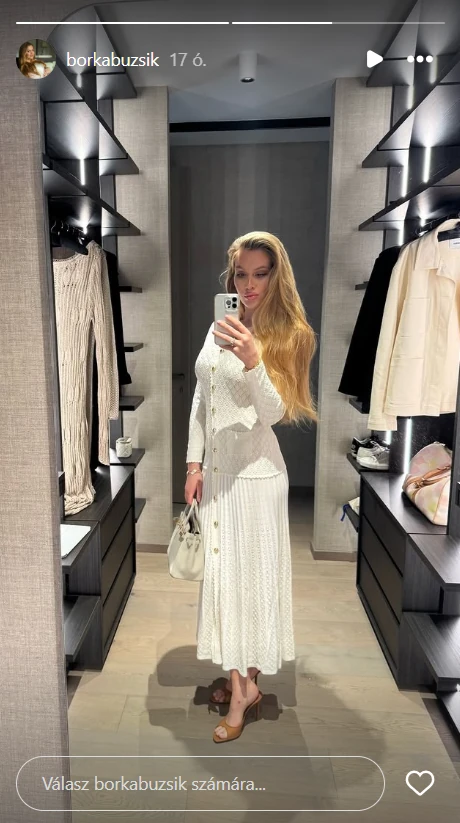 Most pedig Borka magáról osztott meg egy tükörszelfit, amin egyszerűen gyönyörű. A fotón - ami valószínűleg a gardróbjában készült - egy hófehér, hosszú ujjú midi ruhát visel, amit fehér táskával és bézs magassarkúval egészített ki. Az outfitjéből csak úgy árad a nőiesség, az elegancia és a kifinomultság!