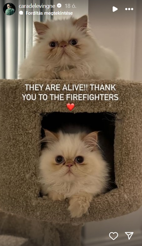 Azért viszont nagyon hálás, hogy két cicáját még időben ki tudták menteni az égő házból a tűzoltók. „Életben vannak. Köszönöm a tűzoltóknak” - írta a macskákról készült fotóhoz.