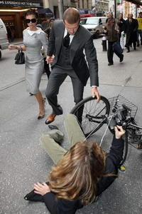 A Beckham-házaspár éppen jó barátjuk, Katie Holmes színházi bemutatójára igyekezett, amikor egy lesben álló fotós hatalmasat esett biciklijével. David Beckham, akit eddig remek szabadrúgásairól ismert a világ, most bebizonyította, hogy valódi úriember. Hirtelen a pórul járt fotós mellett termett és felsegítette a földről. A focistát sok kritika éri a mai napig nem túl bő szókincse miatt, de a focipályán és az utcán is bebizonyítja, hogy a szavaknál sokkal fontosabbak a tettek.