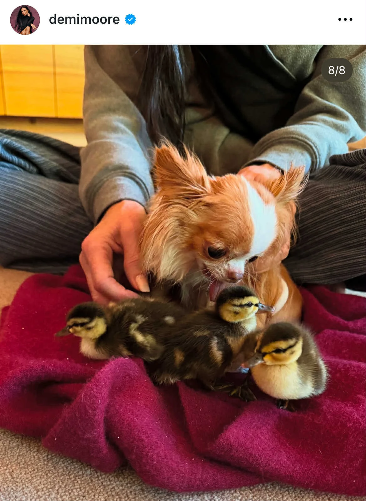 Demi Moore az Instagramon posztolt arról, hogy három elárvult kiskacsát fogadott be, Pilaf nevű csivavája társaságában. „Kacsa, kacsa… Pilaf! Három elárvult kiskacsát mentettünk meg! A helyi állatorvosom segítségével és útmutatásával azon dolgozunk, hogy addig ápoljuk őket, amíg elég nagyok nem lesznek ahhoz, hogy visszatérhessenek a természetes élőhelyükre. Zűrös, de örömteli kaland volt, de Pilaf pedig imádja az új barátait" - írta.