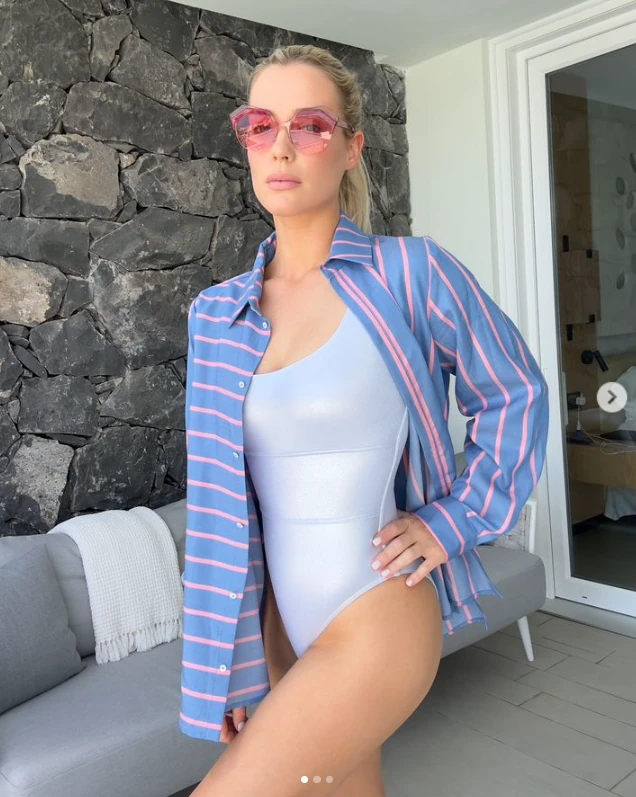 A fotókon egy ezüstszínű - 254 fontos, vagyis közel 120 ezer forintos - fürdőruhában villantotta meg tökéletes alakját, amit egy laza, oversize inggel, ezüst szandállal és rózsaszín napszemüveggel egészített ki.