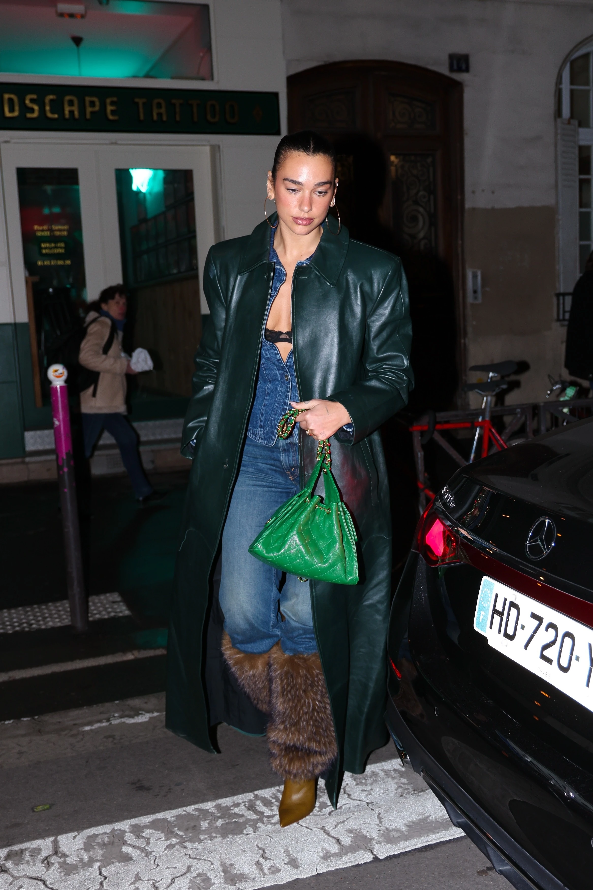 A megjelenését barna, szőrmés csizmával, hosszú, fekete bőrkabáttal, zöld táskával és karika fülbevalókkal egészítette ki, haját pedig szoros kontyba fogta. Szerintünk hibátlan a randi-szettje!