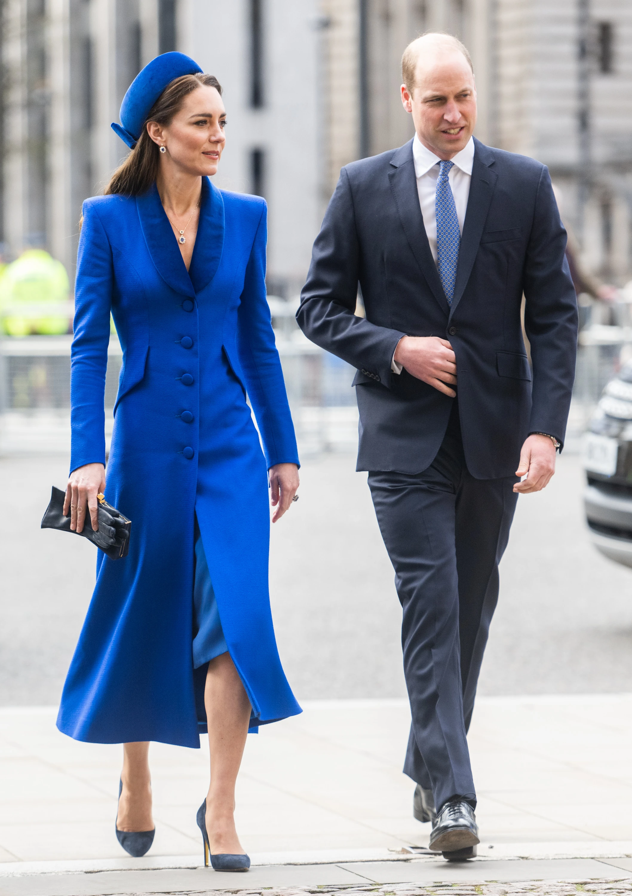 Kate Middleton a kabátruhák nagy kedvelője, ezúttal is egy csodás Catherine Walker márkájú, egyedi tervezésű darabban mutatkozott színben tökéletesen passzoló kiegészítőkkel: a kedvenc és sokszor viselt sötétkék hasított bőr Rupert Sanderson magas sarkúja, Lock & Co kalap és sötétkék bőrkesztyű – sikkes mint mindig.