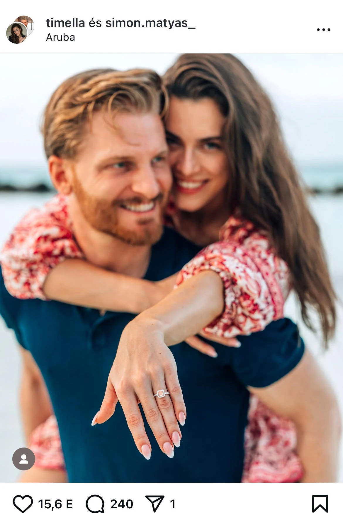 Gelencsér Tímea immár menyasszony, párja egy romantikus tengerparti utazáson kérte meg a kezét. Az eljegyzés helyszíne a festői szépségű Aruba volt, ahol a szerelmesek épp nyaralásukat töltötték. A meghitt pillanatot megörökítő fotón Timi boldogan öleli vőlegényét, miközben büszkén mutatja meg eljegyzési gyűrűjét.