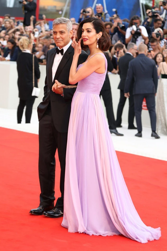 Engesztelésül olyan csodálatosak voltak feleségével, mintha egy tündérmeséből léptek volna elő. Amal lila Versace ruhában, feltűzött hajjal pompázott, férje pedig maradt a klasszikusan elegáns öltöny-csokornyakkendő összeállításnál.