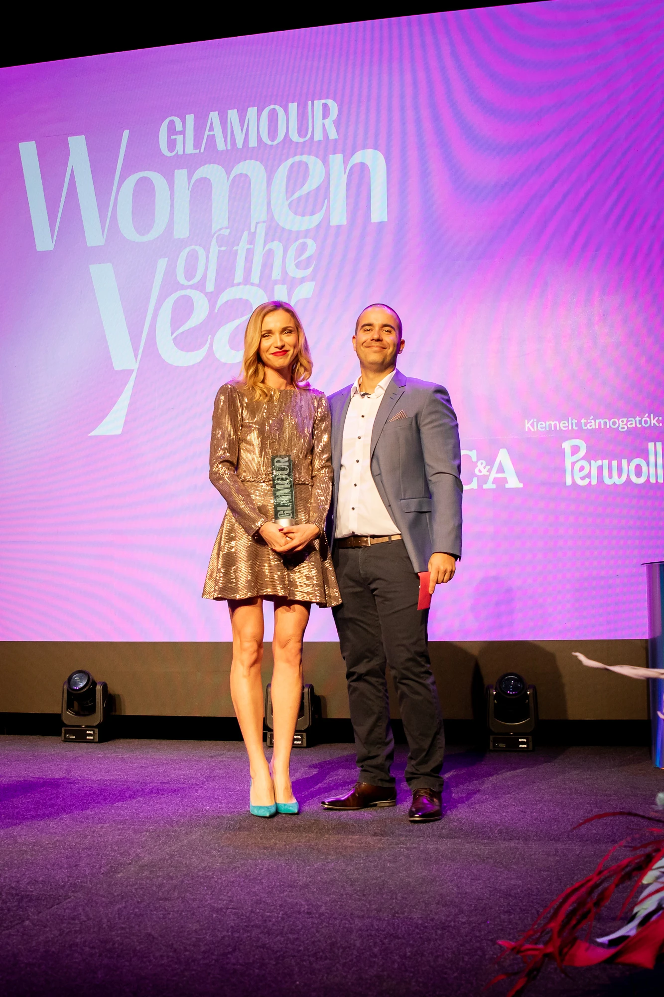 Dobos Evelin, Az év színésznője kategória győztese és Deli Károly, a Carlsberg Hungary Kft. marketing vezetője