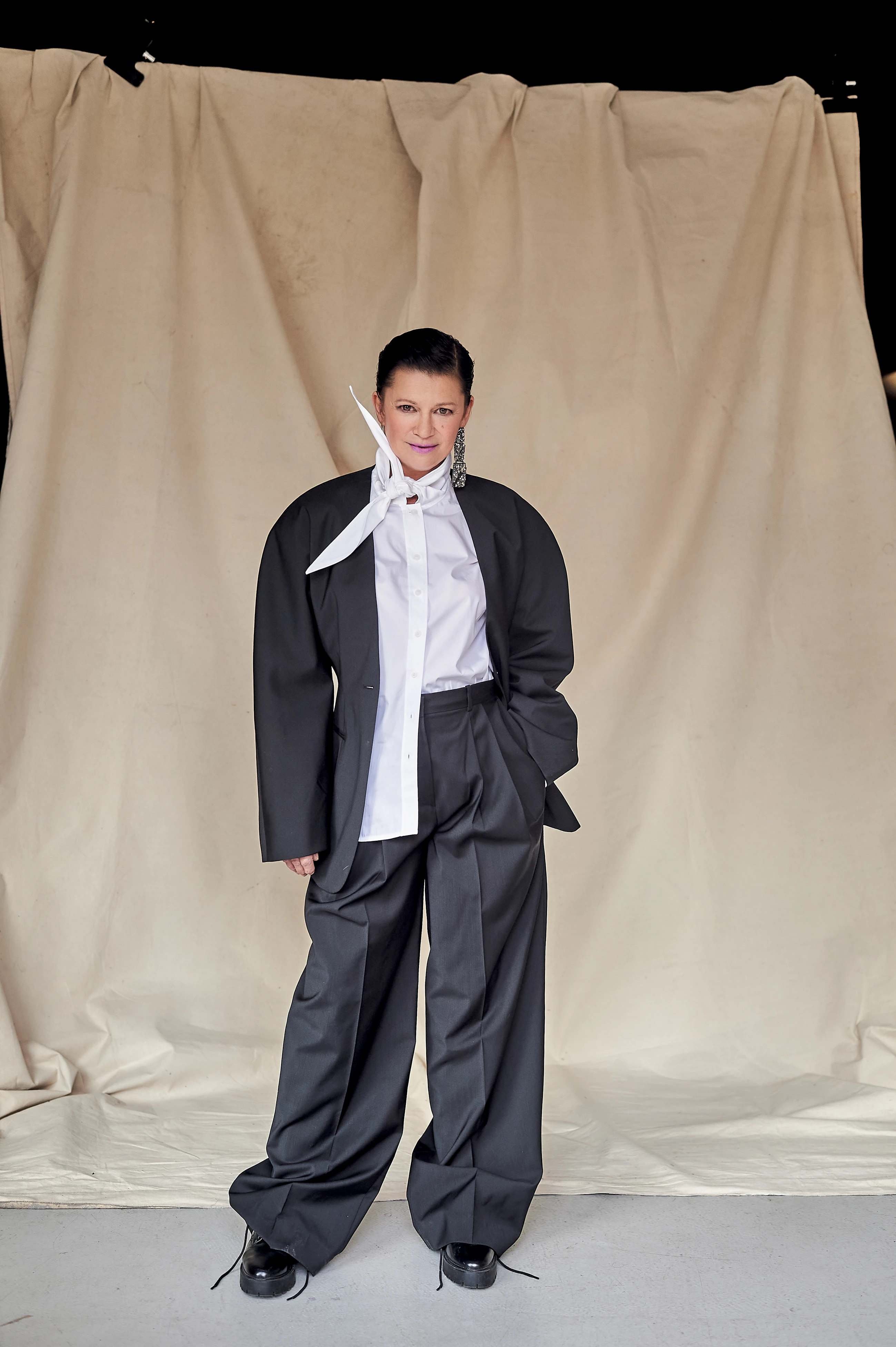 Görbe Nóra fiatalabb éveiben rengeteget játszott színpadon, ma már kevesebb szerepet vállal el - Ing, zakó és nadrág COS, Cipő H & M, Fülbevaló ZARA