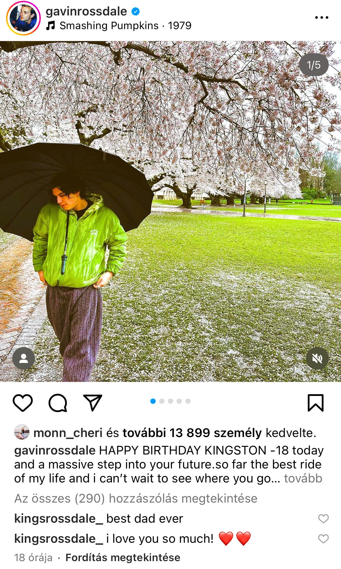 Apja, Gavin Rossdale is egy poszt formájában köszöntötte fiát: „BOLDOG SZÜLETÉSNAPOT KINGSTON - 18 vagy ma és ez egy hatalmas lépés a jövőd felé. Életem eddigi legjobb utazása, és alig várom, hogy lássam, merre haladsz innen. Teljes mértékben hiszek benned, és mélyen csodálom a benned lévő férfit" - írta. „Nem tudnálak jobban szeretni, mint amennyire szeretlek. Kívánok sok boldogságot, egészséget és kreativitást. Szeretlek, apa" - tette hozzá.