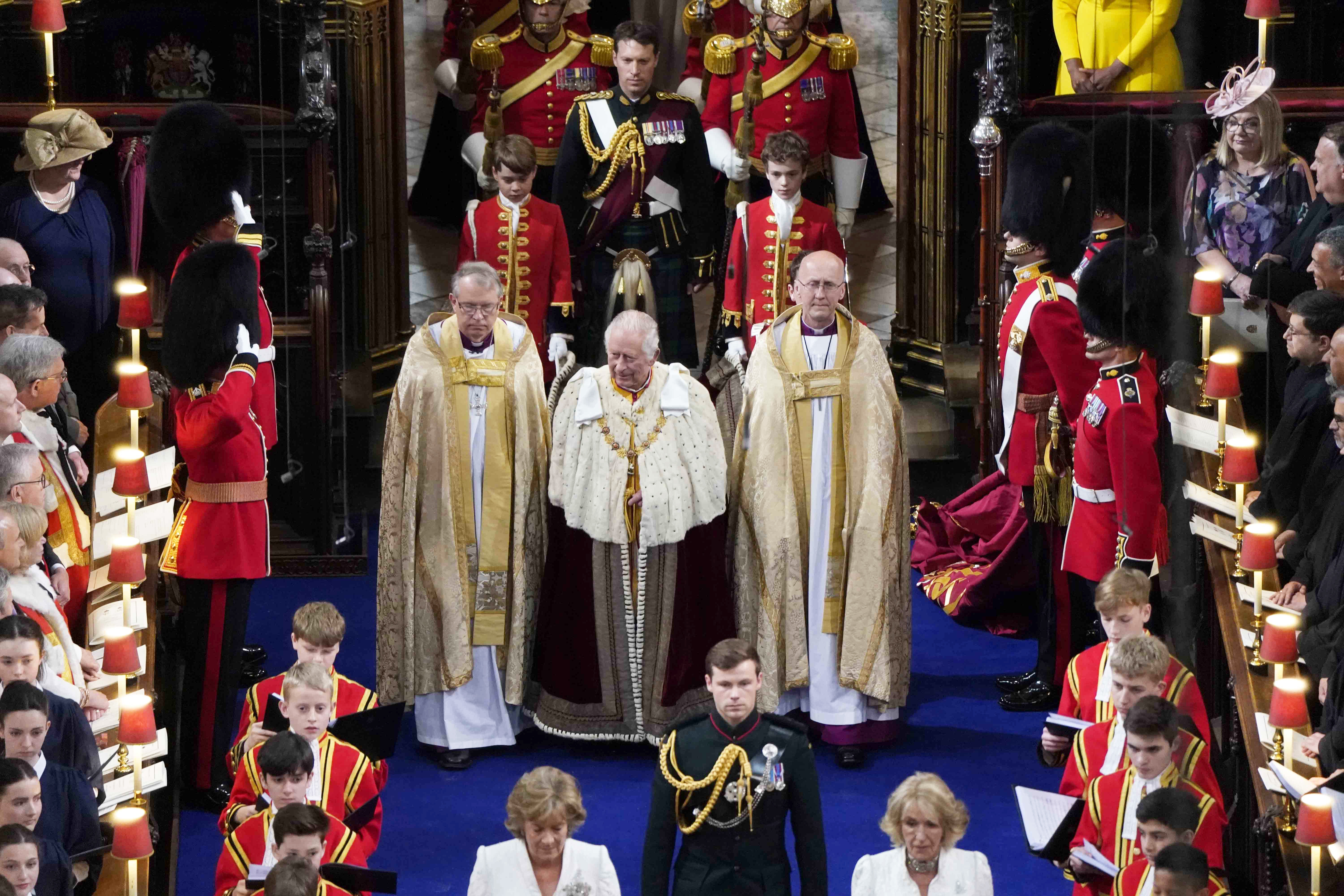 Károly király és Kamilla királyné Erzsébet királynő gyémántjubileumi állami hatfogatos hintóján érkeztek a helyszínre. A koronázási ceremónián Károly király a hagyományokhoz híven az állami karmazsin bársonypalástot viselte, amelyet többek között legidősebb unokája – aki második a brit királyi család trónöröklési rendjében – vitt nagypapája mögött a Westminster-apátságba való bevonuláskor.