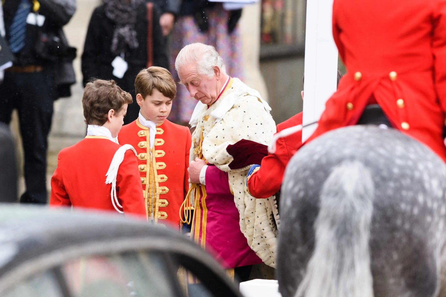 Károly király és Kamilla királyné Erzsébet királynő gyémántjubileumi állami hatfogatos hintóján érkeztek a helyszínre. A koronázási ceremónián Károly király a hagyományokhoz híven az állami karmazsin bársonypalástot viselte, amelyet többek között legidősebb unokája – aki második a brit királyi család trónöröklési rendjében – vitt nagypapája mögött a Westminster-apátságba való bevonuláskor.