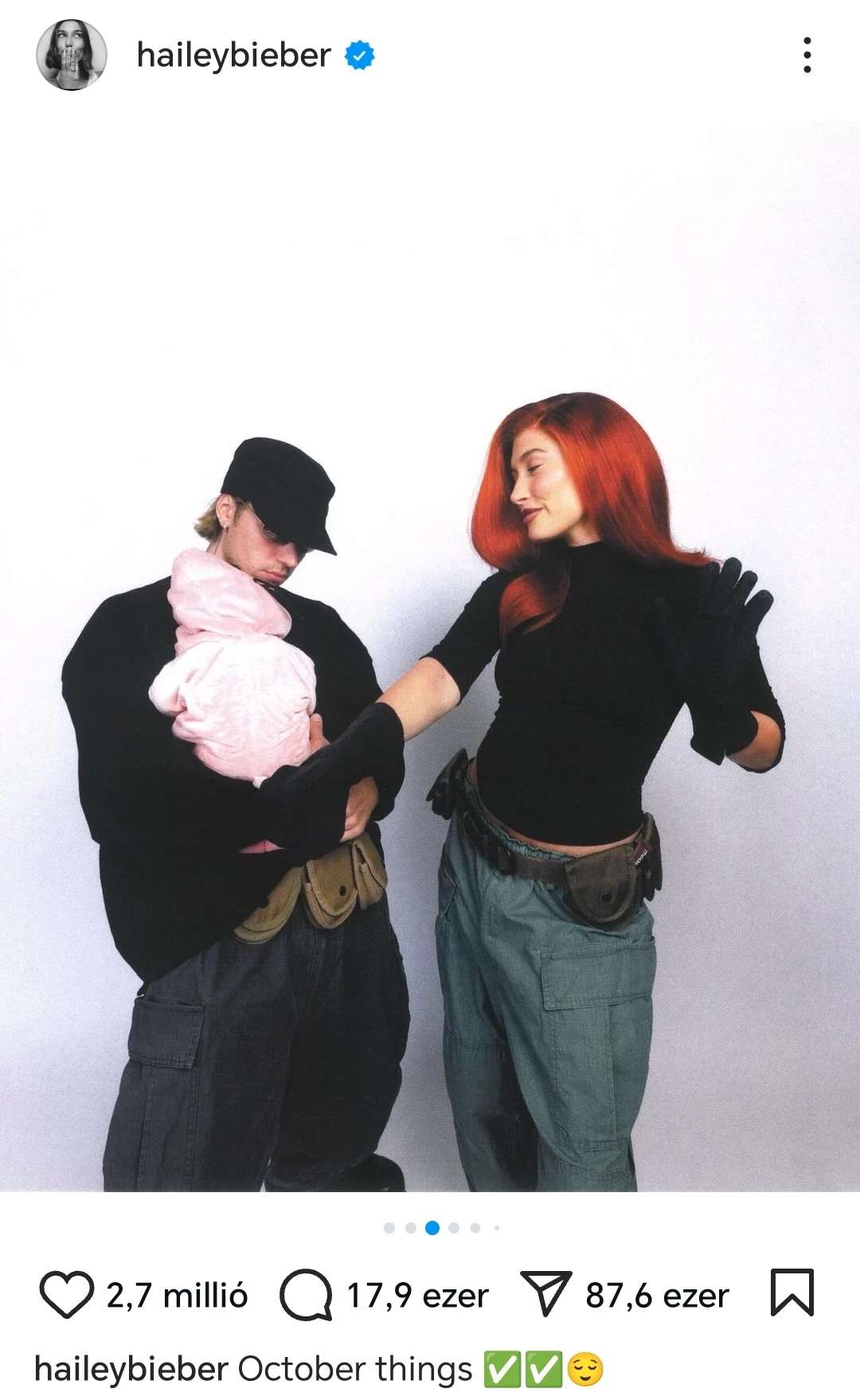 A halloweeni fotón Hailey a tini hősnő, Kis Possible bőrébe bújt, míg férje a karakter barátjának, Ron Stoppable-nek öltözött, kisfiuk pedig Ron kisállatának, Rufusnak. A cuki képen a büszke apuka épp a karjában ringatja a kicsit, Hailey pedig mosolyogva simogatja. Persze, arra a szülők most is nagyon ügyeltek, hogy Jack arcából a fotón semmi ne látsszon.