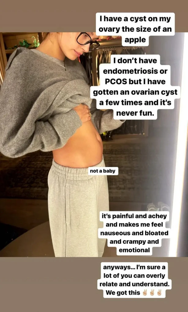 Hailey Bieber egy Instagram sztoriban nyílt meg követői előtt: egy szelfit posztolt, amelyen pólóját felhúzva megmutatja a hasát és megmagyarázza, mi is történik vele pontosan. „Alma méretű ciszta van a petefészkemben” – írta, majd egy rövidebb felirattal a csupasz hasa mellett egyértelművé tette, hogy ez „nem egy baba”. „Nincs endometriózisom vagy PCOS-em, de néhányszor már volt petefészek cisztám, és sosem szórakoztató. Nagyon fájdalmas, émelygek, puffadok, görcsölök és érzelmes vagyok.” – tette hozzá.
