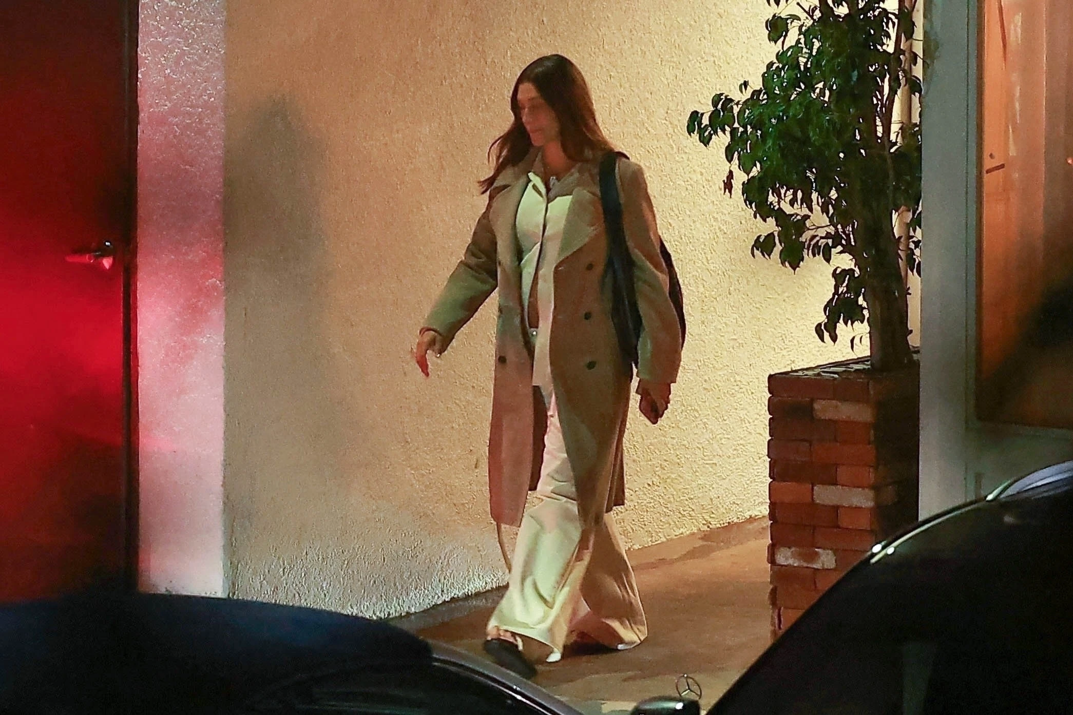 A modell Justin Bieber nélkül érkezett vacsorázni, hogy a barátaival töltse az estét. Egy széles, fehér szárú farmert viselt gombos búzzal, aminek csak a tetejét gombolta be, így minden lépésnél apró, de annál szembetűnőbb módon villantotta meg hasát.