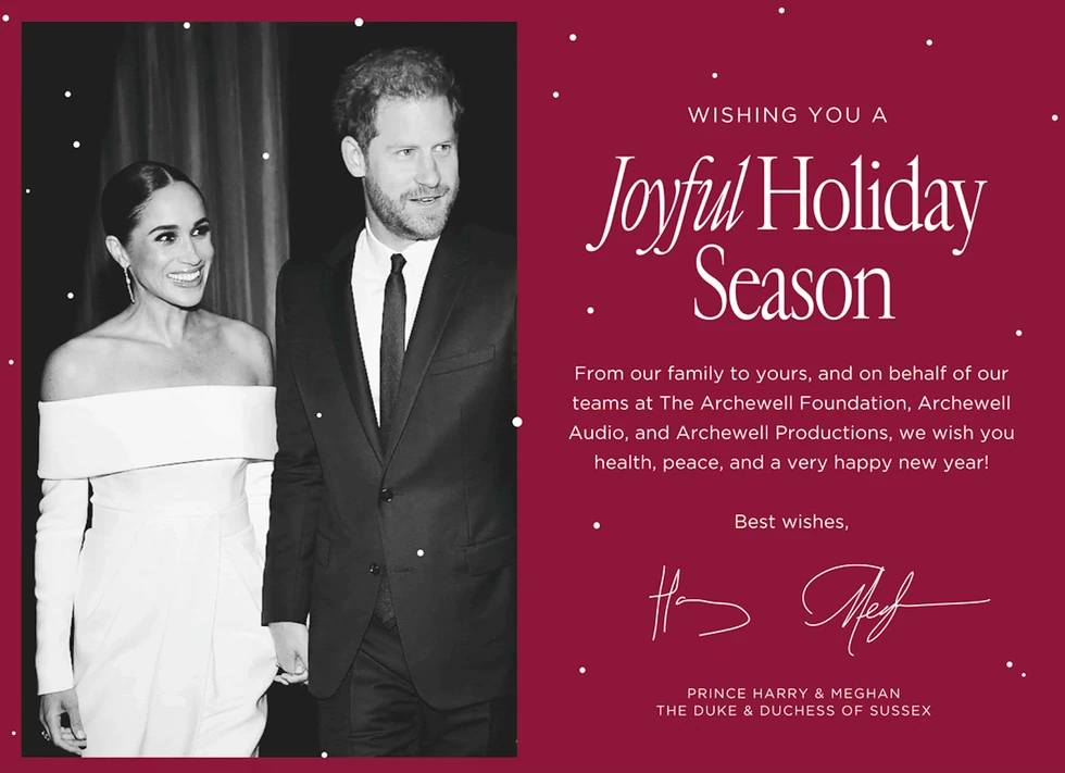 A 2022-es ünnepi képeslapon szereplő fotó a közelmúltban készült, méghozzá a New Yorkban rendezett Robert F. Kennedy Ripple of Hope-díj gálán. „Örömteli ünnepeket kívánunk!” – áll a képeslapon. „A The Archewell Foundation, az Archewell Audio és az Archewell Productions csapatai nevében egészséget, békét és nagyon boldog új évet kíván családunk mindenkinek!" A jókívánságot aláírásukkal zárták.