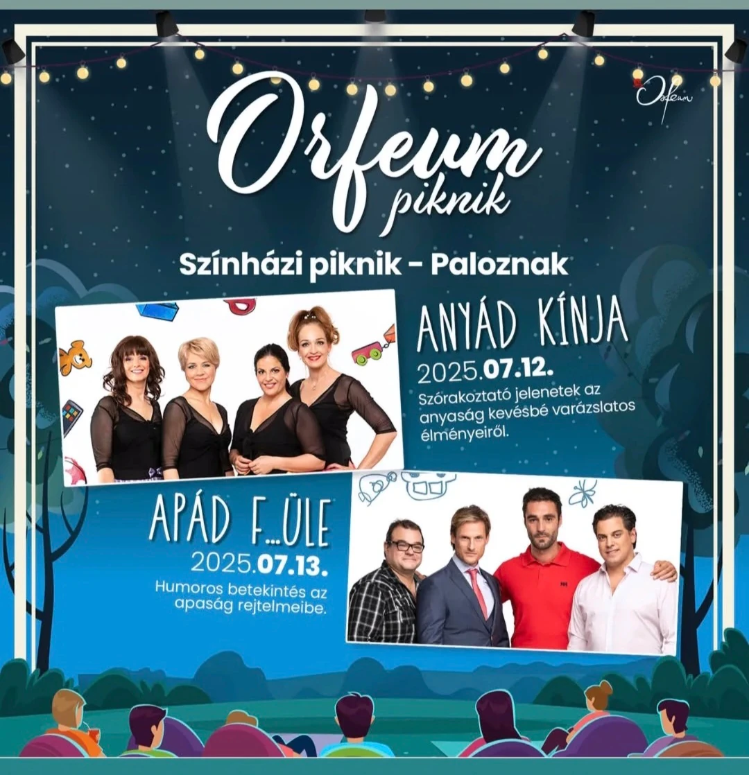 Mert sok nő még mindig kínosnak érzi, ha nem tökéletes az élete, ha fáradt vagy kimerült. Régen nem illett erről beszélni – ma már szerencsére lehet. Most nyáron, az Orfeum égisze alatt Paloznakon is előadjuk ezt a darabot: az Anyád kínja július 12-én, annak férfi verziója, az Apád füle pedig 13-án lesz látható Adorjáni Bálint, Nagy Sándor és Fenyő Iván előadásában. Ez egy szabadtéri színházi piknik lesz, gulyáslevessel, friss kenyérrel, remek borokkal – és persze előadásokkal.