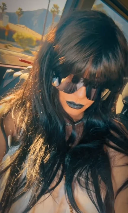 Az 52 éves modell gondolt egy merészet és felvett egy fekete parókát, és hogy tovább fokozza a hatást, fekete rúzst is kent a szájára. Feltette napszemüvegét is, így elsőre mi sem mondtuk volna meg, hogy őt látjuk a videón.