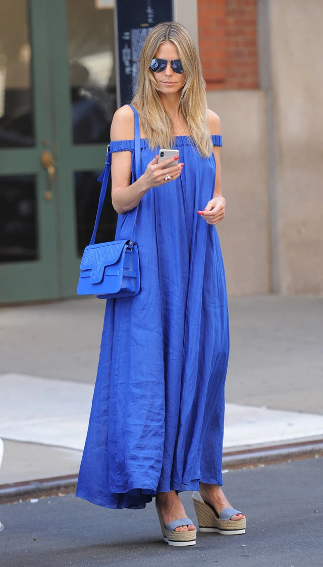 Heidi Klum a napokban New York utcáit szelte egy tökéletes, hosszú, királykék ruhában. A ruhájához, egy ugyanolyan színű kék táskát, és egy telitalpú magas sarkú cipőt viselt. Az biztos, hogy a 45 éves modell nem is öregszik, ahogyan az is, hogy elképesztően menő anyuka.