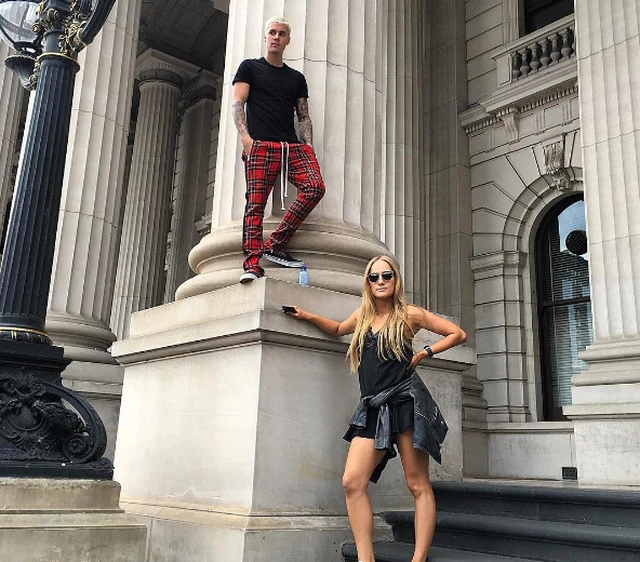 Justin pár napja készült fotóján flanel pizsamaszerű szettben pózol egy ausztrál színésznővel, Georgie Jennings-szel. Justin és Georgie nem érnek egymáshoz, sőt, az énekes egy oszlopra is felmászott, így legalább két méterrel magasabb a szőkeségnél.