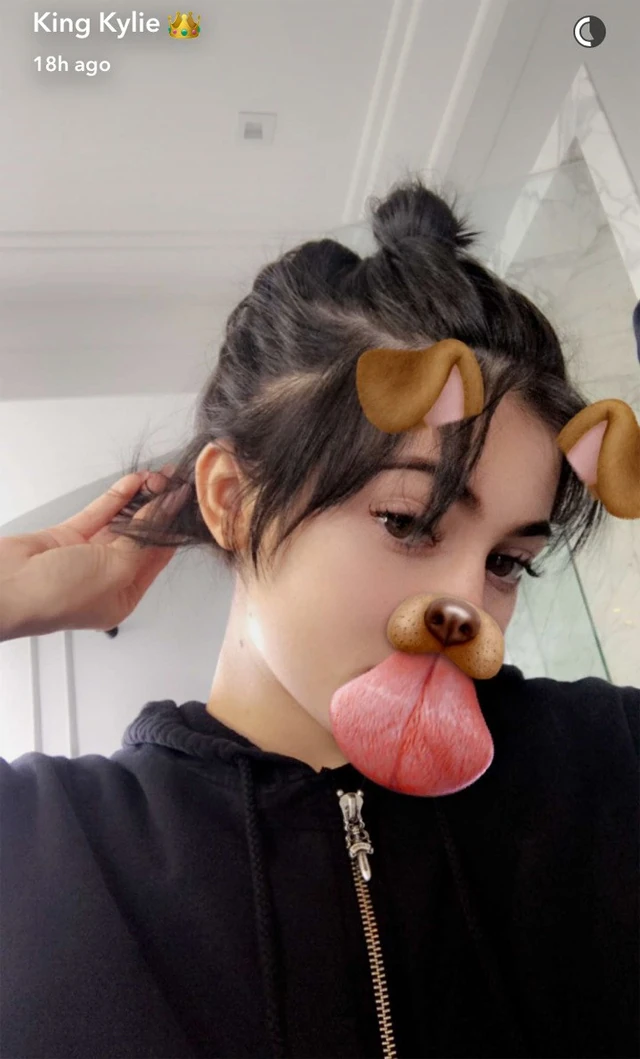 Szerencsére Kylie elébe ment a problémának, és egy Snapchates fotósorozatban megmutatta, hogyan is néz ki mindenféle neon és pasztell színek nélkül, természetes barna hajkoronájával. (A kutyafilter persze nem maradhatott el.)