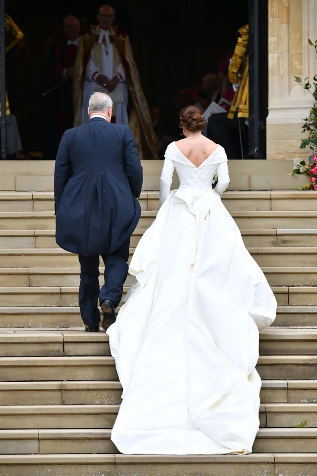 Nos, mivel Meghan egy igencsak visszafogott, ám annál elegánsabb Givenchy kreációban ment férjhez, Eugéniának igazából nem volt nehéz dolga. A hercegnő egy meseszép Peter Pilotto ruhában vonult az oltár elé, a vállra ejtett V-kivágású dekoltázs modern nő látszatát keltette, aki még a fátyolról is lemondott, hátulról viszont a gazdag, hímzett szatén uszállyal olyan volt, akárcsak egy mesebeli királylány.