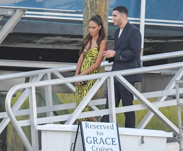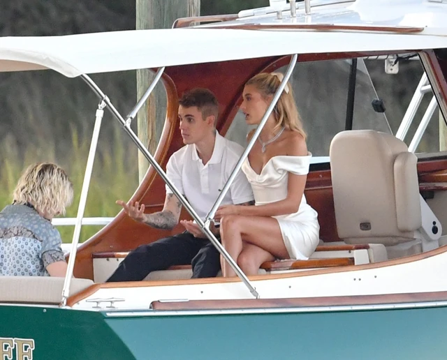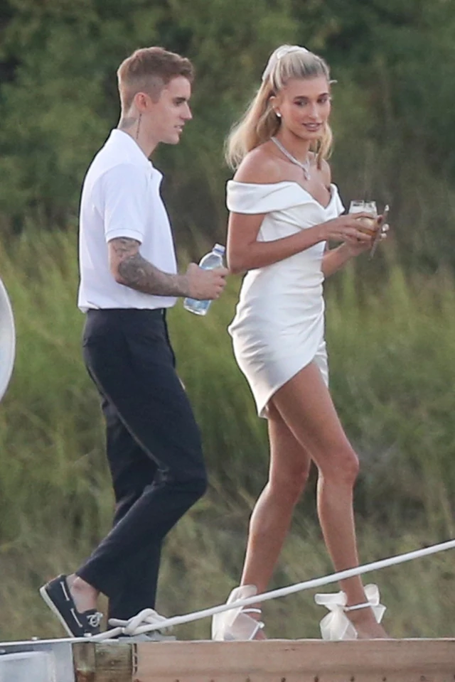Justin Bieber és Hailey Bieber egy motorcsónak felé vették az irányt, ami elszállítja őket a Dél-Karolina állambéli luxus üdülőterepre, ahol az esküvőt tartják. Justin fekete nadrágban és fehér pólóban vág neki az útnak, menyasszonya pedig egy csinos fehér, ejtett vállú szatén miniruhában tipeg mellette nagy masnis, fehér Jimmy Choo cipőben.