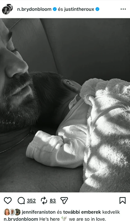Justin Theroux és Nicole Brydon Bloom egy érzelmes Instagram-bejegyzésben adták a világ tudtára: megszületett első közös gyermekük, egy kisfiú. „Megérkezett, annyira szerelmesek vagyunk” – írták a fotó mellé, amivel azonnal hatalmas gratulációáradatot indítottak el. A rajongók azonban hamar kiszúrták, hogy a bejegyzést Jennifer Aniston is kedvelte, ezzel jelezve, hogy szívből örül az 54 éves színész és 32 éves felesége boldogságának.