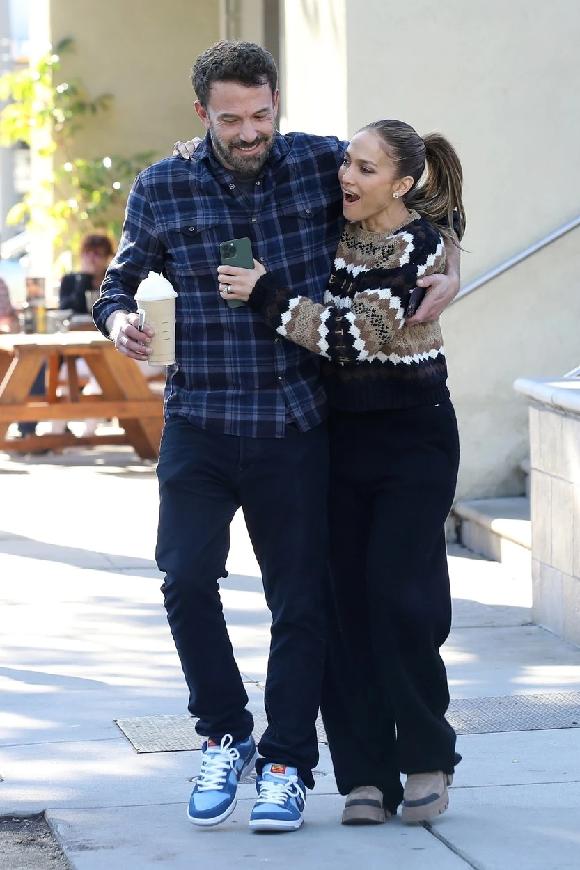 Az 50 éves színész és 53 éves felesége szeretetteljesen átkarolva sétáltak el a kávézótól az autójukig. Jennifer Lopez egy mintás Valentino pulóvert, fekete nadrágot és egy bézs bakancsot viselt. Haját egyszerű lófarokba kötötte, ami természetesen istenien állt neki. Ben Affleck szintén a kényelem mellett döntött, így tengerészkék flanel ingben, egy sötét farmernadrágban és kék Nike tornacipőben jelent meg a rövid kiruccanáson.