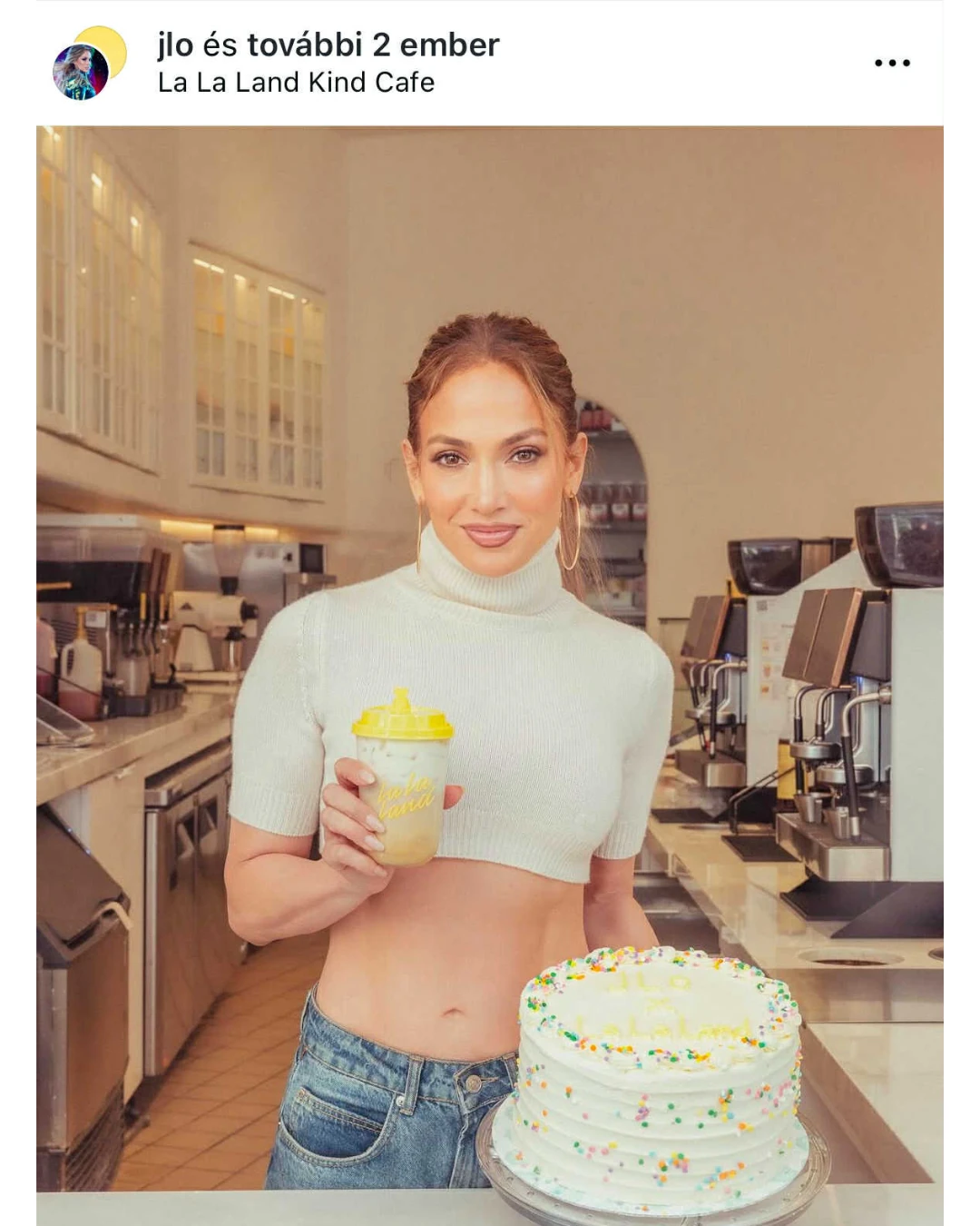 „A @LaLaLandKindCafe megálmodta a JLo Birthday Cake Latte-t, amit kifejezetten a szülinapomra alkottak meg. Imádtam elkészíteni! Július 24-től bármelyik La La Land kávézóban kapható lesz ez az édes, születésnapi finomság, amit sok szeretettel küldök nektek, a La La Landdel együtt!"