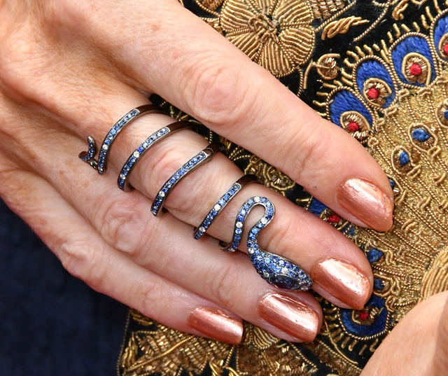 Az írónő a vörös szőnyegen egy vállra ejtett kék ruhában lépett, azonban a rendkívül stílusos kiegészítőit meg kell nézned közelebbről is: a Sophia Webster cipője tulajdonképpen egy újragondolt cikesz volt az arany pillangószárnyacskáknak köszönhetően, az egyik kezén pedig egy csillogó, kék kígyó alakú gyűrűt viselt, a Mardekár ház szimbólumát.