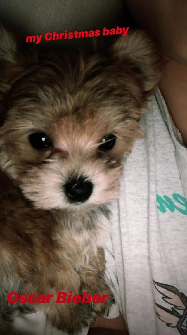 Justin Bieber Instagram oldalán egy képet tett közzé, amin félmeztelenül fekszik az ágyban, és rajta hever kiskutyusuk. Hailey Bieber is számos sztorit közzé tett, amiben új házikedvencük, Oscar Bieber szerepel.