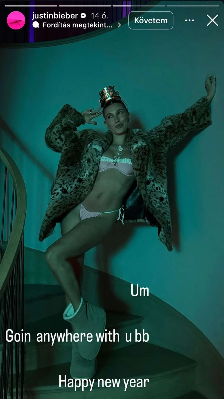 A fotón Hailey Bieber egy lépcsőfordulóban pózol boldogan bikiniben és szőrmekabátban, Happy New Year feliratú tiarával a fején, büszke férje pedig a Daily Mail szerint ezzel az üzenettel egészítette ki a képet: