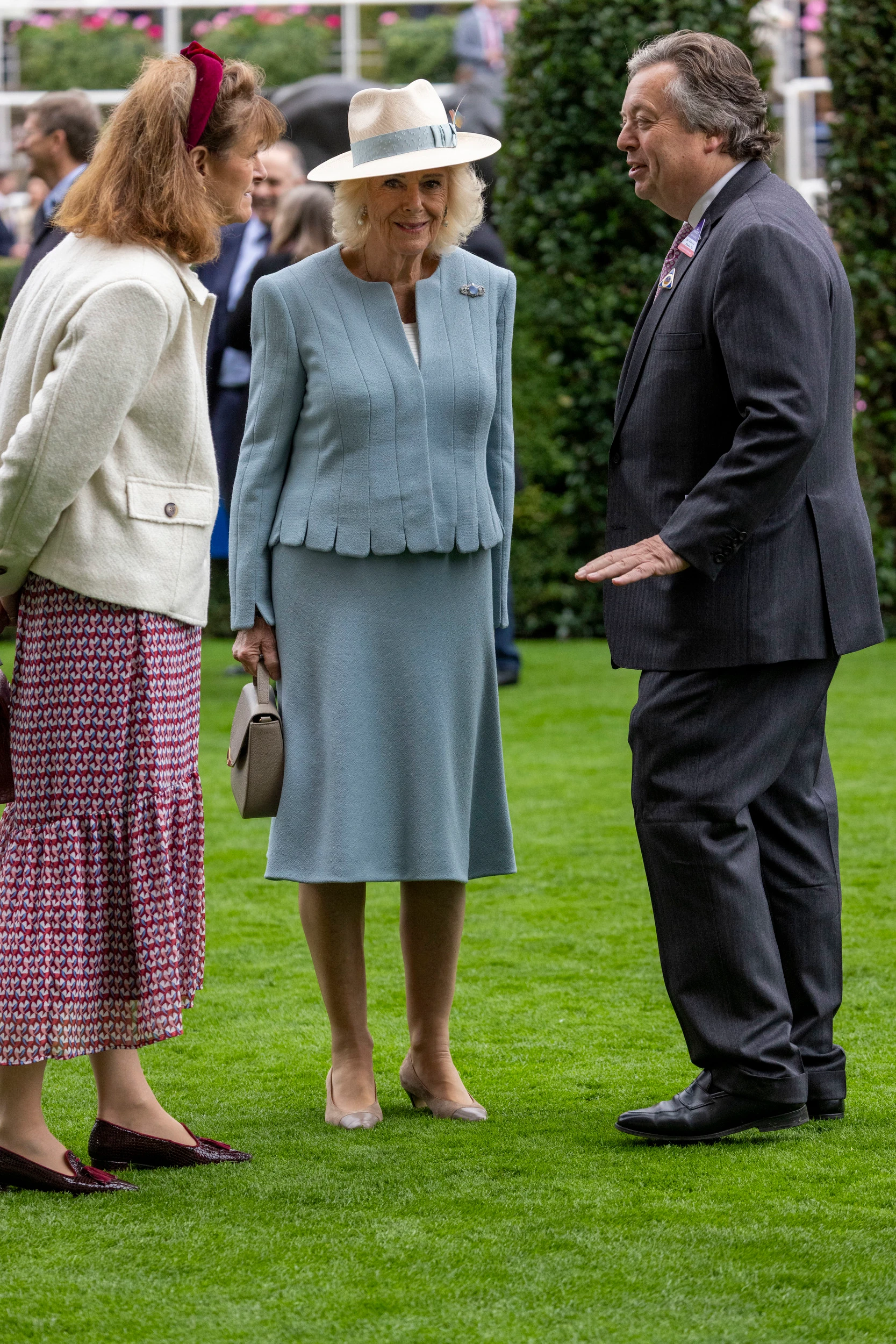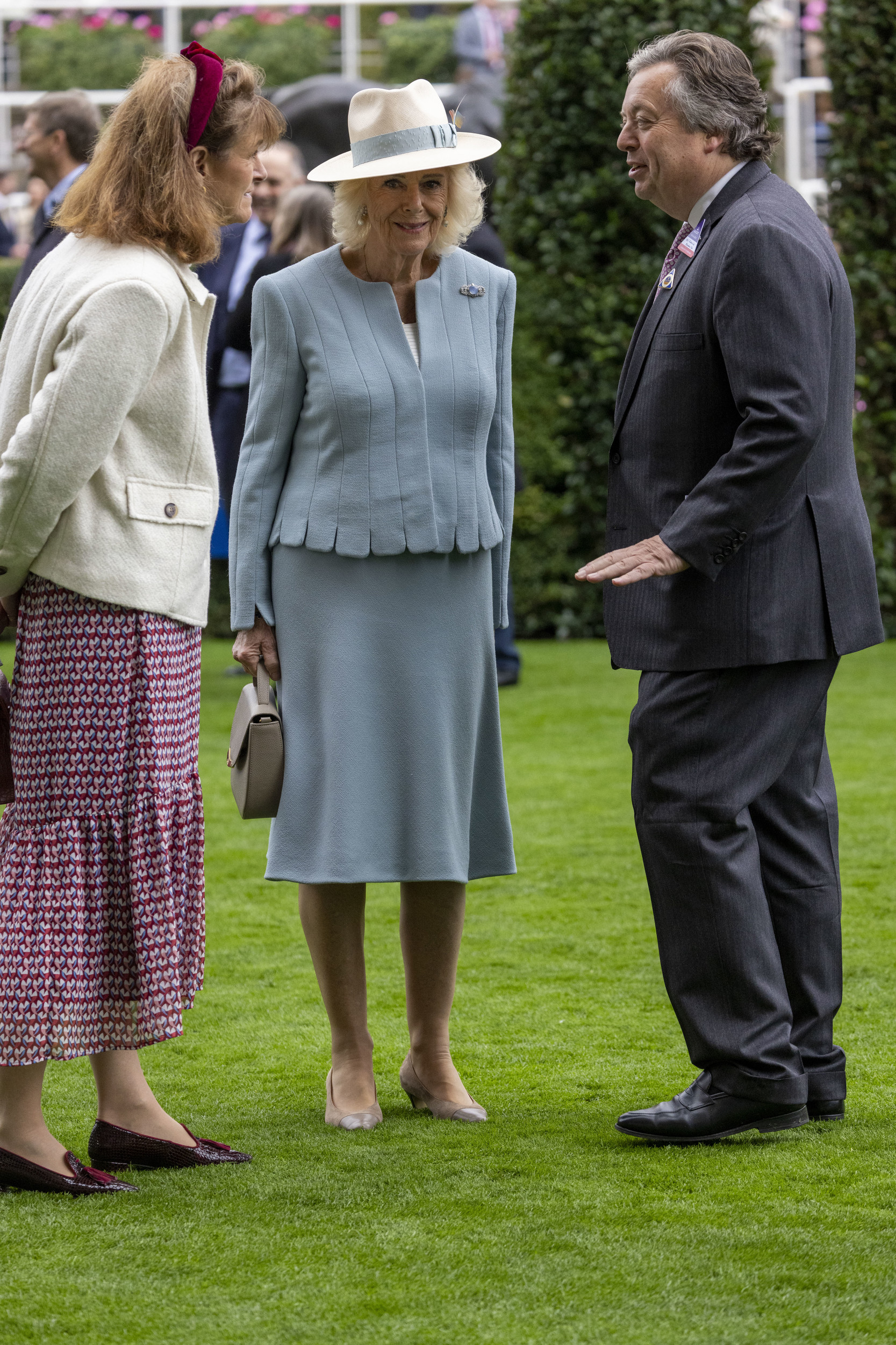 Sógora bejelentése után néhány órával Kamilla részt vett a Qipco British Champions Day-en, a berkshire-i Ascot versenypályán. Az eseményre halványkék kosztümben és krémszínű kalapban érkezett, blézerét pedig egy káprázatos, világoskék holdkőből és gyémántokból álló bross díszítette.