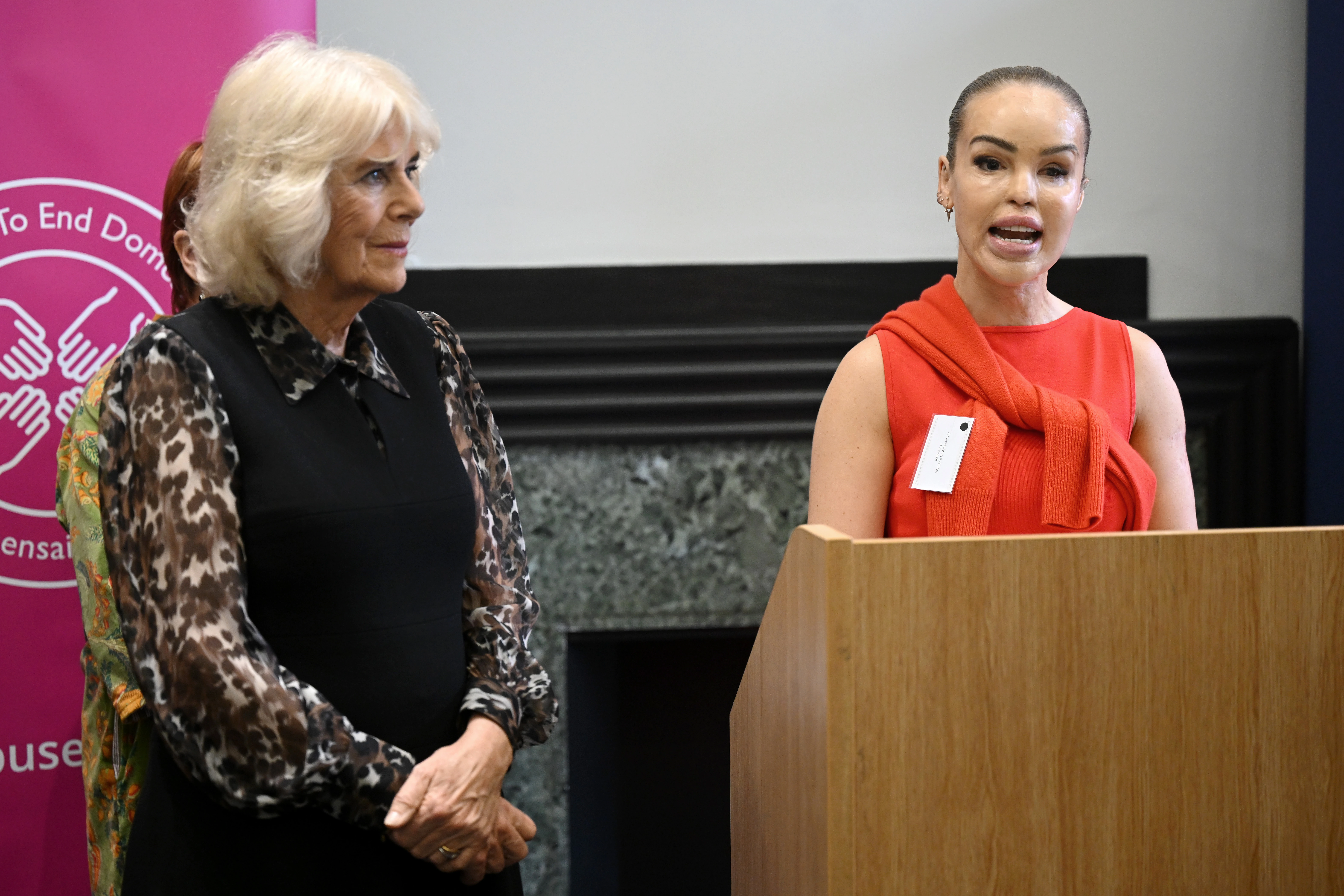 Kamilla királyné és a Women's Aid nagykövete, Katie Piper, akit 2008 márciusában volt barátja öntött le savval