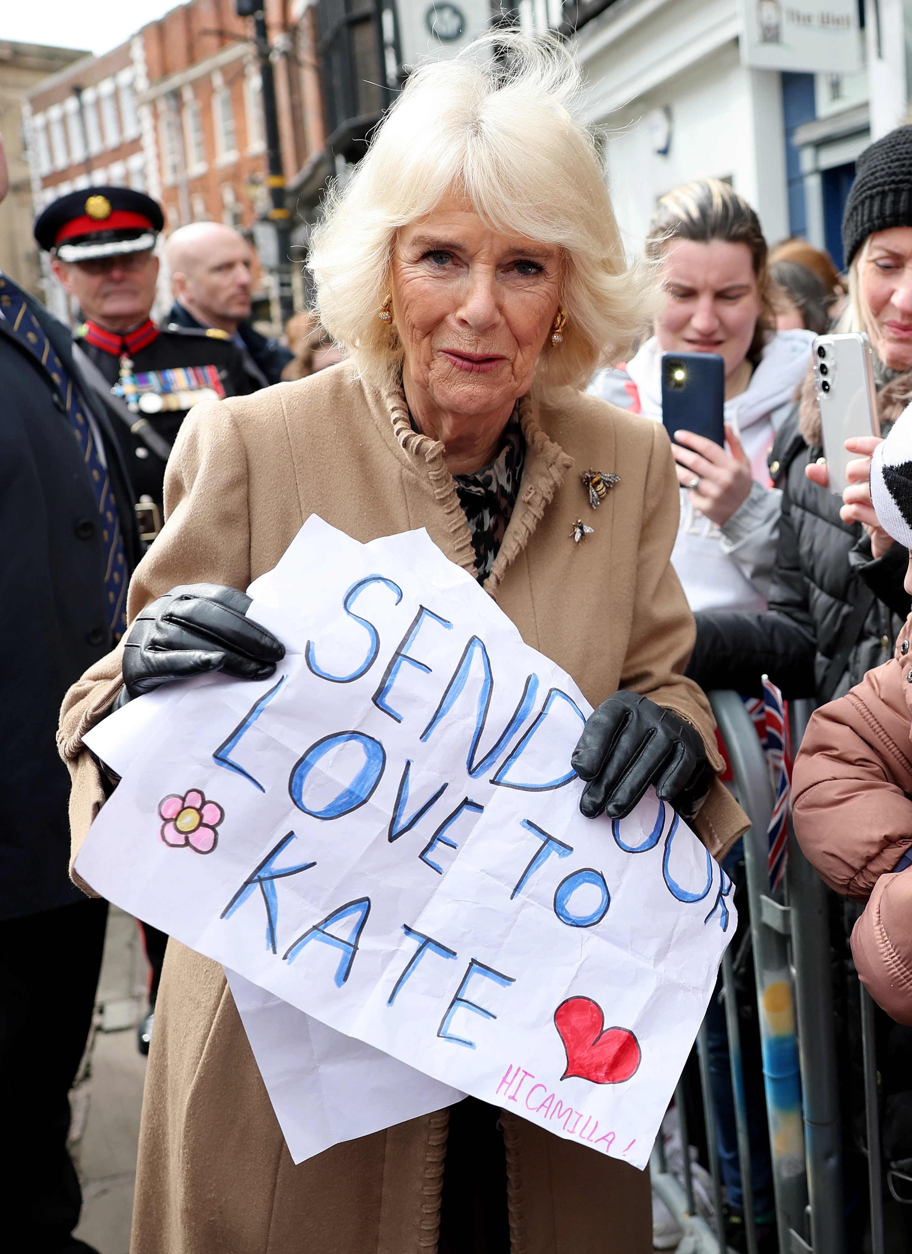 A 76 éves Kamilla királyné átvette ké brit lány támogató és szeretettel készült szívecskés-virágos plakátját, amit Katalin hercegné számára címeztek. Őfelsége biztosította a rajongókat arról, hogy a rákbetegséggel küzdő címzett mindenképp megkapja az üzenetüket. Majd hozzátette: a hercegné teljesen el van ragadtatva a nagyközönség töretlen támogatásától - írta meg a HELLO!. Ezt követően a fotósoknak is megmutatta a plakátot, amelyen ez állt: „Szeretetet küldünk Katalin hercegnének”.