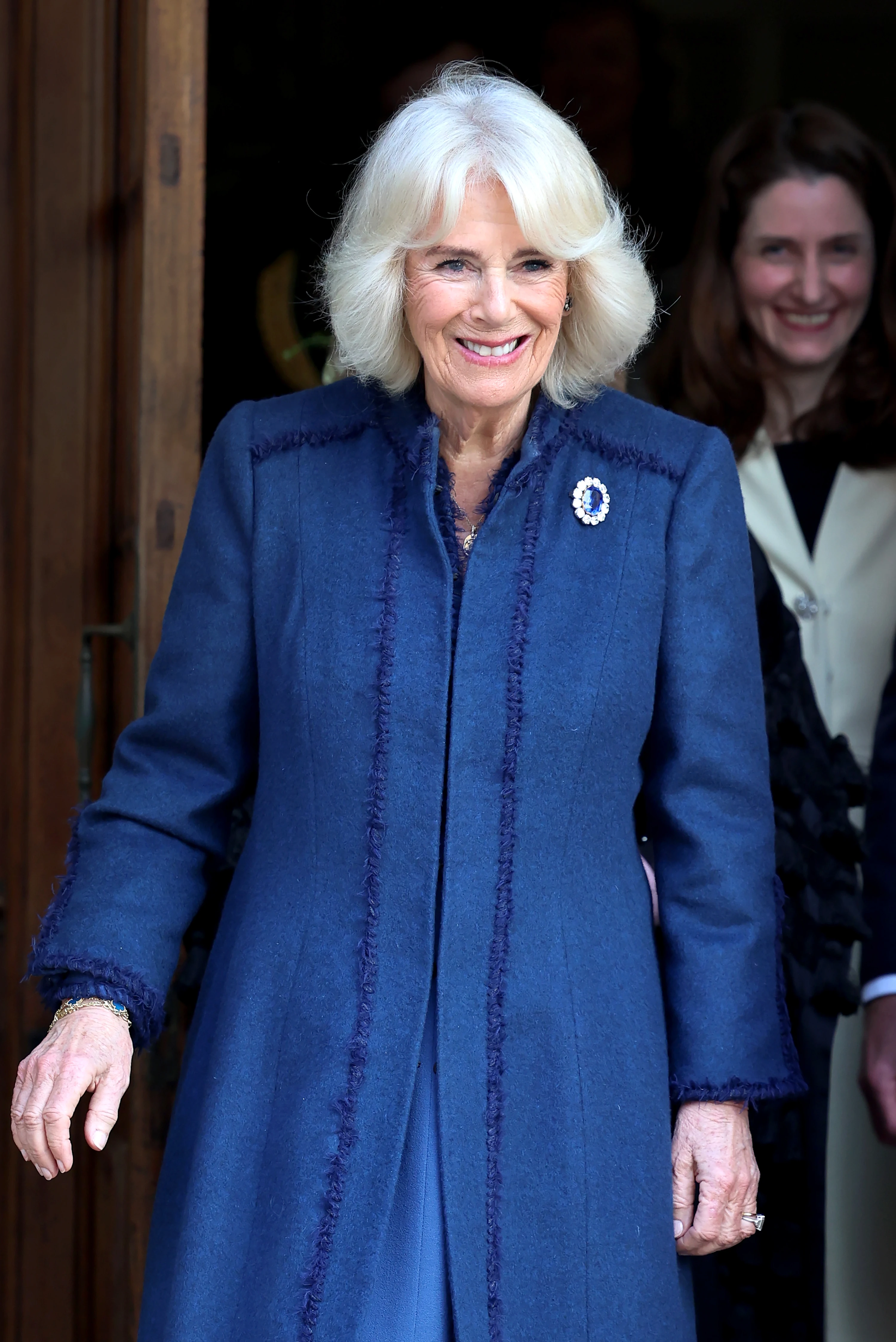 Kamilla királyné egy zafír-gyémánt brossal tisztelgett Katalin hercegné előtt. Ez onnan tudható, hogy a brit uralkodóné ékszere pontosan úgy néz ki, mint a leendő királyné eljegyzési gyűrűje. (A Page Six cikke szerint a hasonlóság nem véletlen, ugyanis a bross designja inspirálta a gyűrűt.)