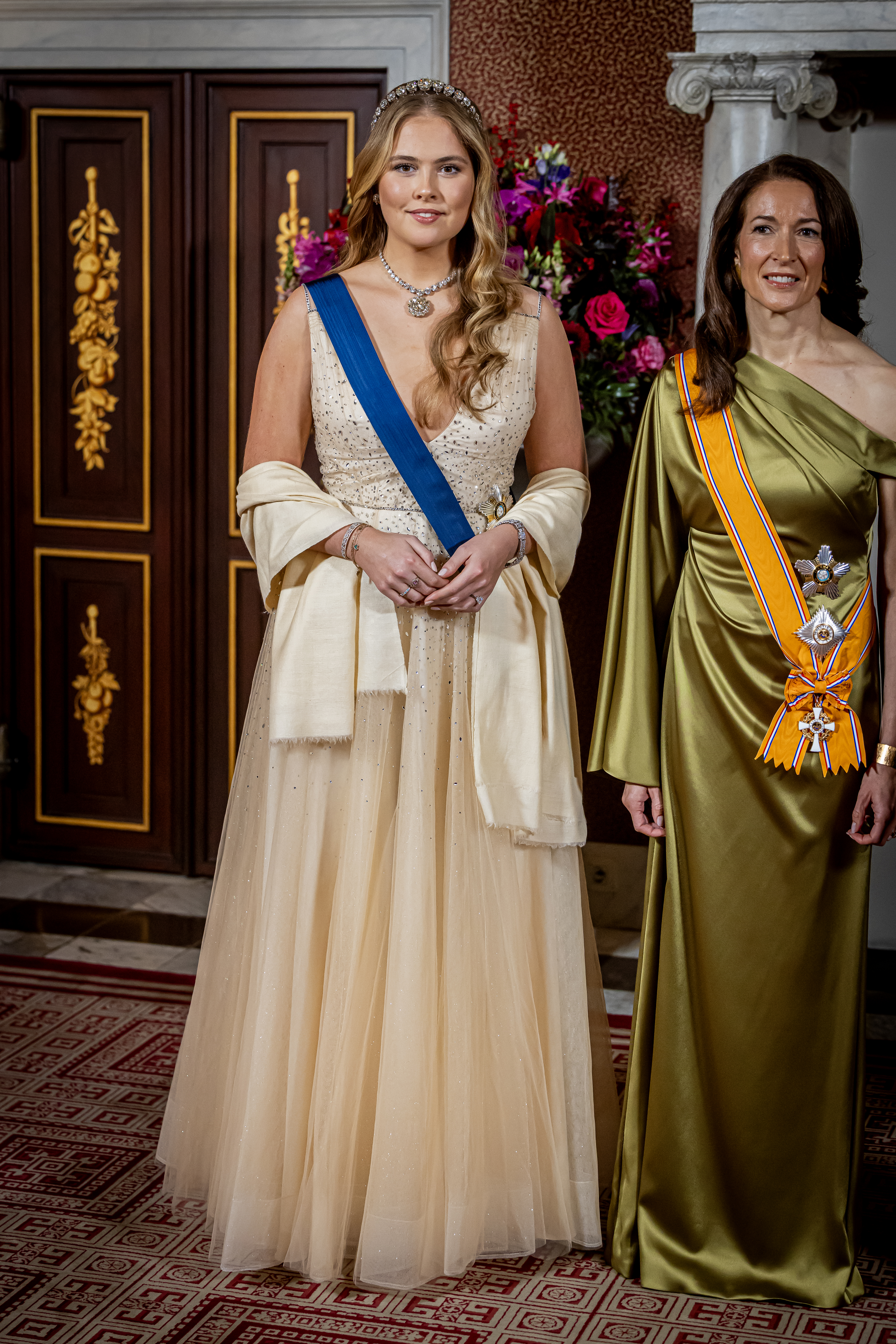 Ott volt Vilmos Sándor király és felesége, Máxima királyné, valamint a lányuk, Katalin Amália hercegnő. A 22 esztendős trónörökös csak úgy vonzotta a tekinteteket, gyakorlatilag ellopta a showt. Egy barackszínű, földig érő báli ruhát viselt egy hozzá illő kendővel. Kiegészítőként pedig édesanyja kedvenc tiaráját tette fel.