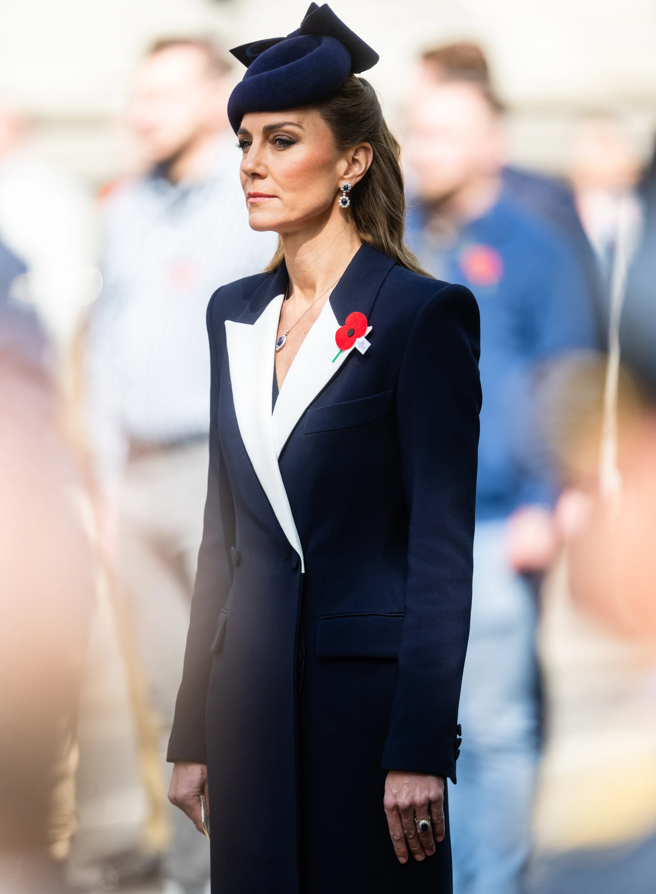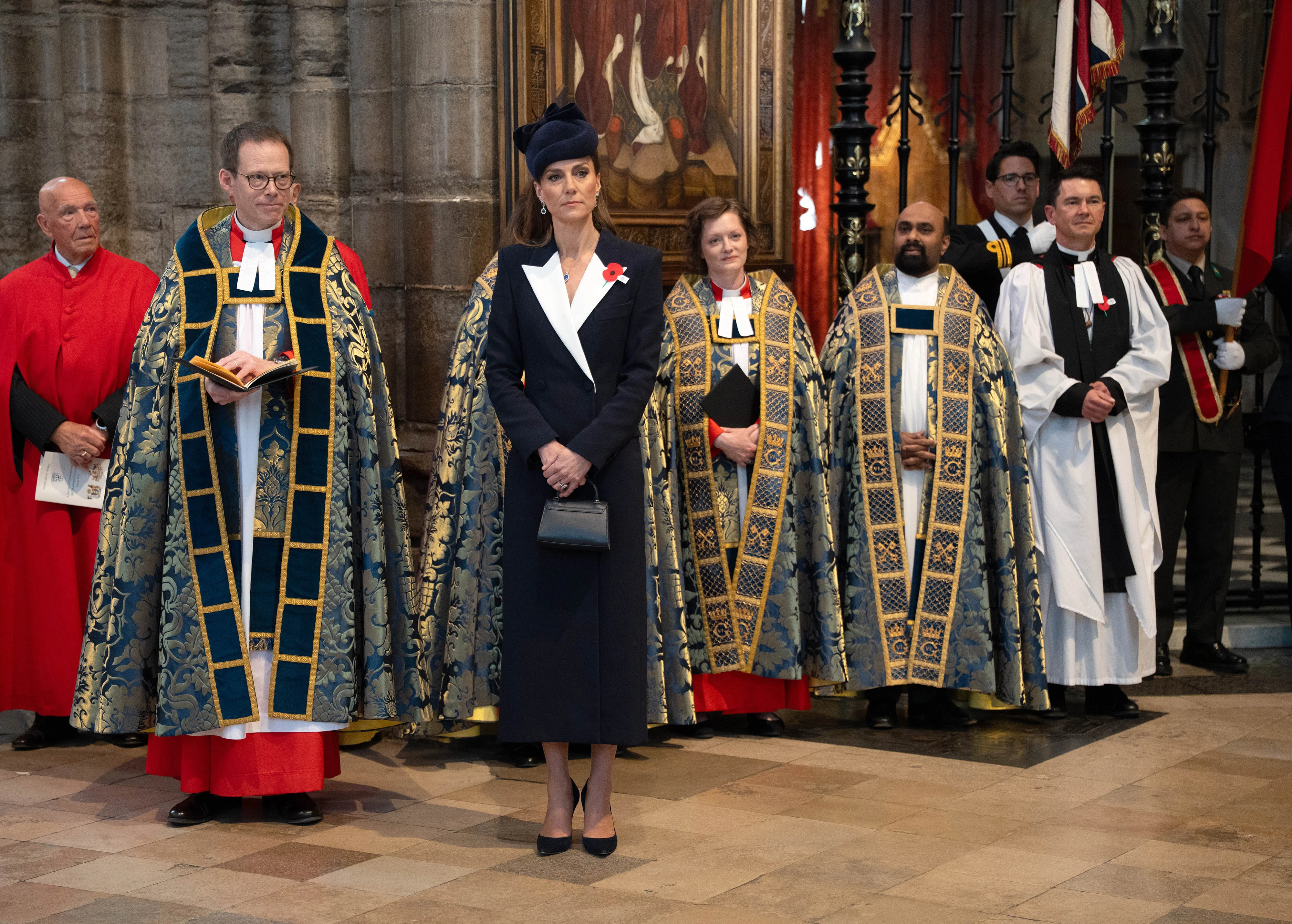 A walesi hercegné egy sötétkék, Sarah Burton által tervezett Alexander McQueen kabátot viselt, amit egy hozzá illő Jane Taylor London kalappal, valamint egy DeMellier táskával és cipővel egészített ki. És bár szemmel láthatóan egyedül érkezett, a pipacsokkal díszített koszorún egy Katalin hercegné és Vilmos hereg által írt felirat volt olvasható: