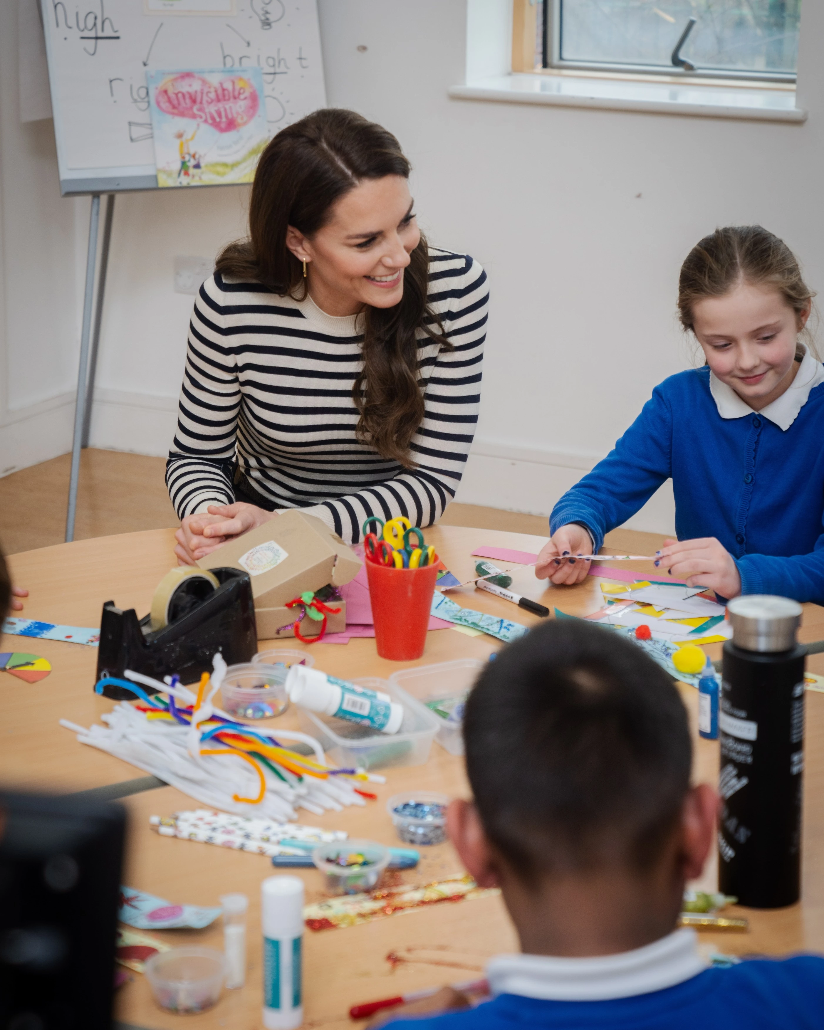 Február második hete a Gyermekek Mentális Egészségének Hete – ennek alkalmából a wales-i hercegné meglátogatta londoni St. John's Általános Iskola gyermekeit, hogy az emberi kapcsolatok fontosságáról és az érzések különbözőségéről beszélgessenek. A látogatásra a lezser elegancia megtestesítőjeként érkezett: egy kötött, breton csíkos felsőt viselt fekete magas derekú nadrággal, amit egy szintén fekete övvel egészített ki. Akár azt is mondhatnánk, hogy Katalin laza öltözködését a klasszikus francia lány stílusjegyeivel bolondították meg.