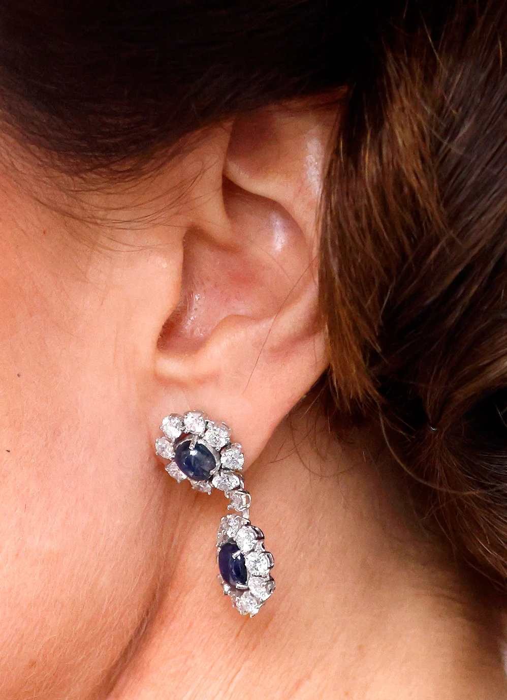 Katalin hercegné egy fehér, hímzett mintájú tengerészkék Erdem peplum kabátban és szoknyában érkezett. Megjelenését sötétkék kalappal és egy pár zafír-gyémánt fülbevalóval egészítette ki, amely korábban Diana hercegnőé volt. Az összképet pedig a Károly királytól kapott gyönyörűség bross koronázta meg.