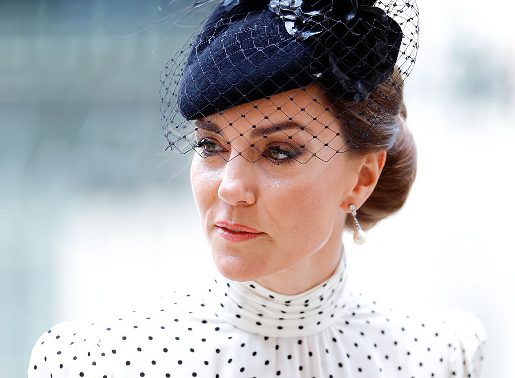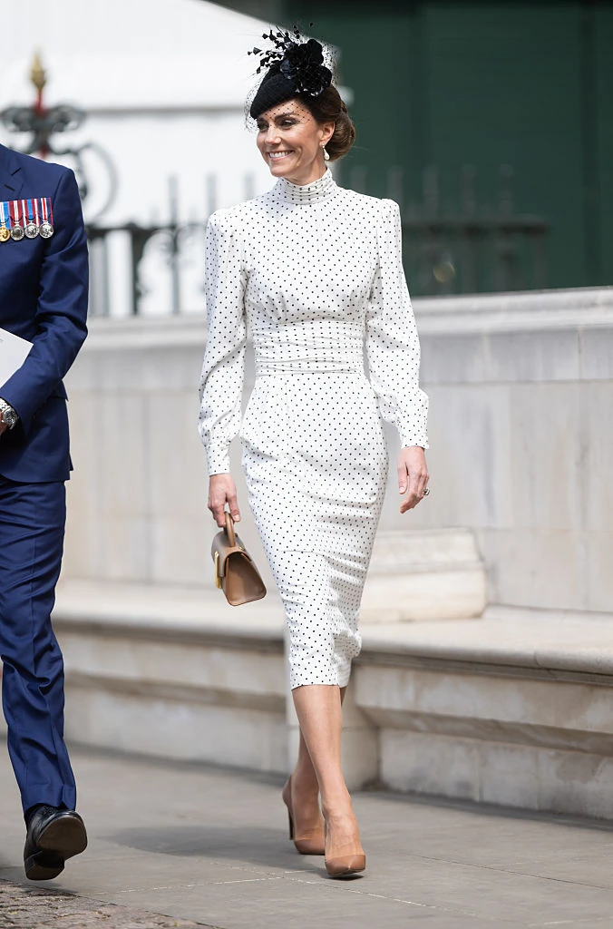 Az eseményre a walesi hercegné egy fekete-fehér, pöttyös, hosszú ujjú Alessandra Rich kreációban érkezett, amit egy fekete, hálós Juliette Botterill kalappal, barna DeMellier táskával és barna Ralph Lauren magassarkúval egészített ki.