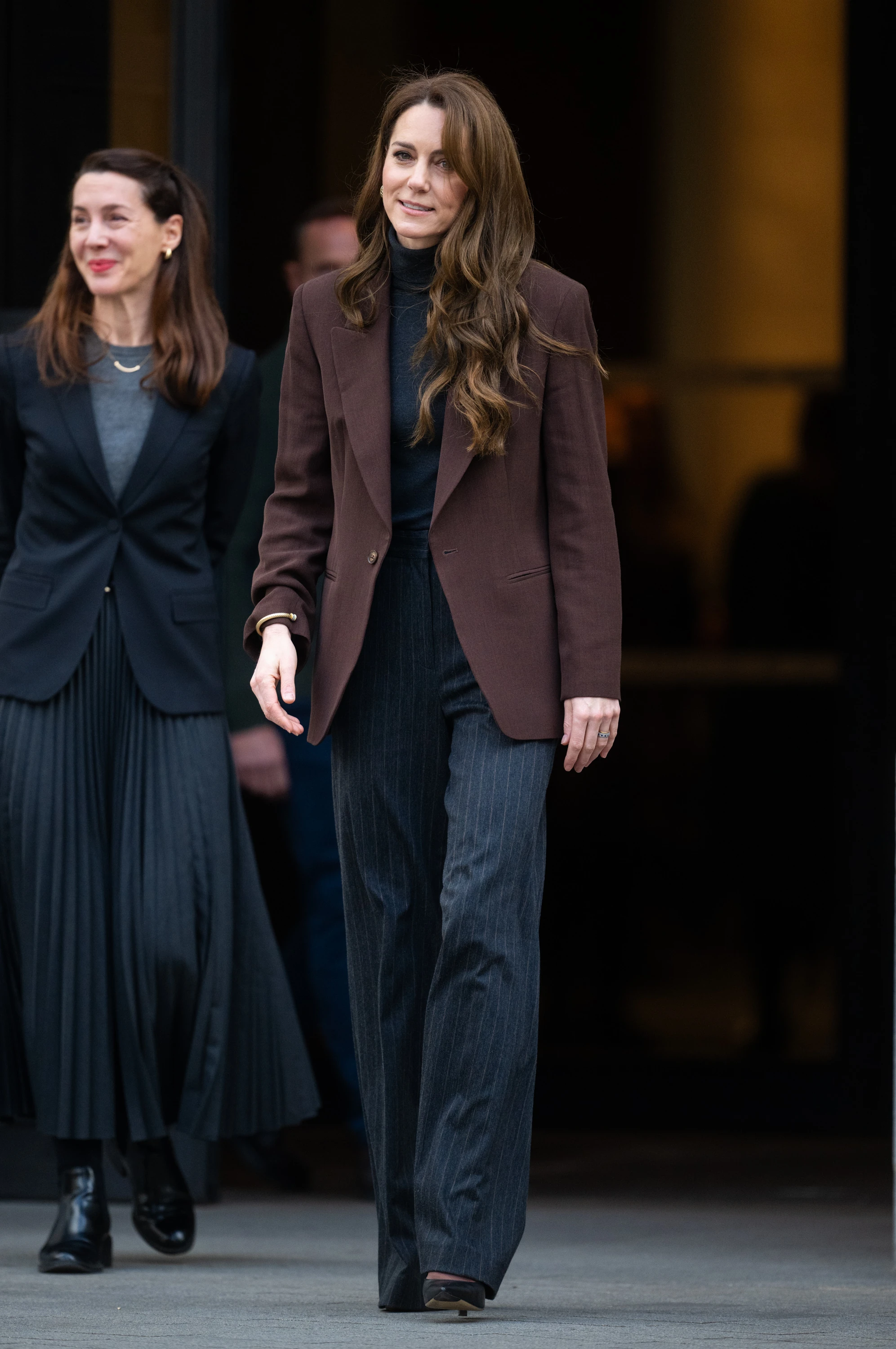 Katalin hercegné a minap egy csoport iskolás gyermeket kísért el a Nemzeti Arcképtárba Londonban, a háromgyermekes édesanya sugárzóan mosolygott, miközben egy kisbuszból szállt ki és egy kislány kezét fogva besétált az épületbe. De ami még izgalmasabb: a hercegné az alkalomhoz - és persze önmagához - illően kifinomult stílust választott: fekete, csíkos, széles szárú nadrágot és garbót viselt, amelyhez egy szűkített barna blézert párosított.