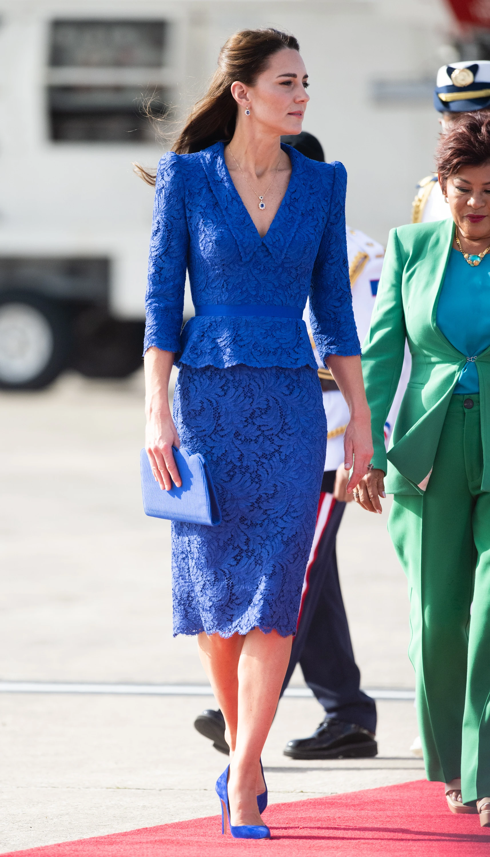 Katalin kék, csipkés Jenny Packham kosztümöt viselt és hozzáillő clutch-ot választott.