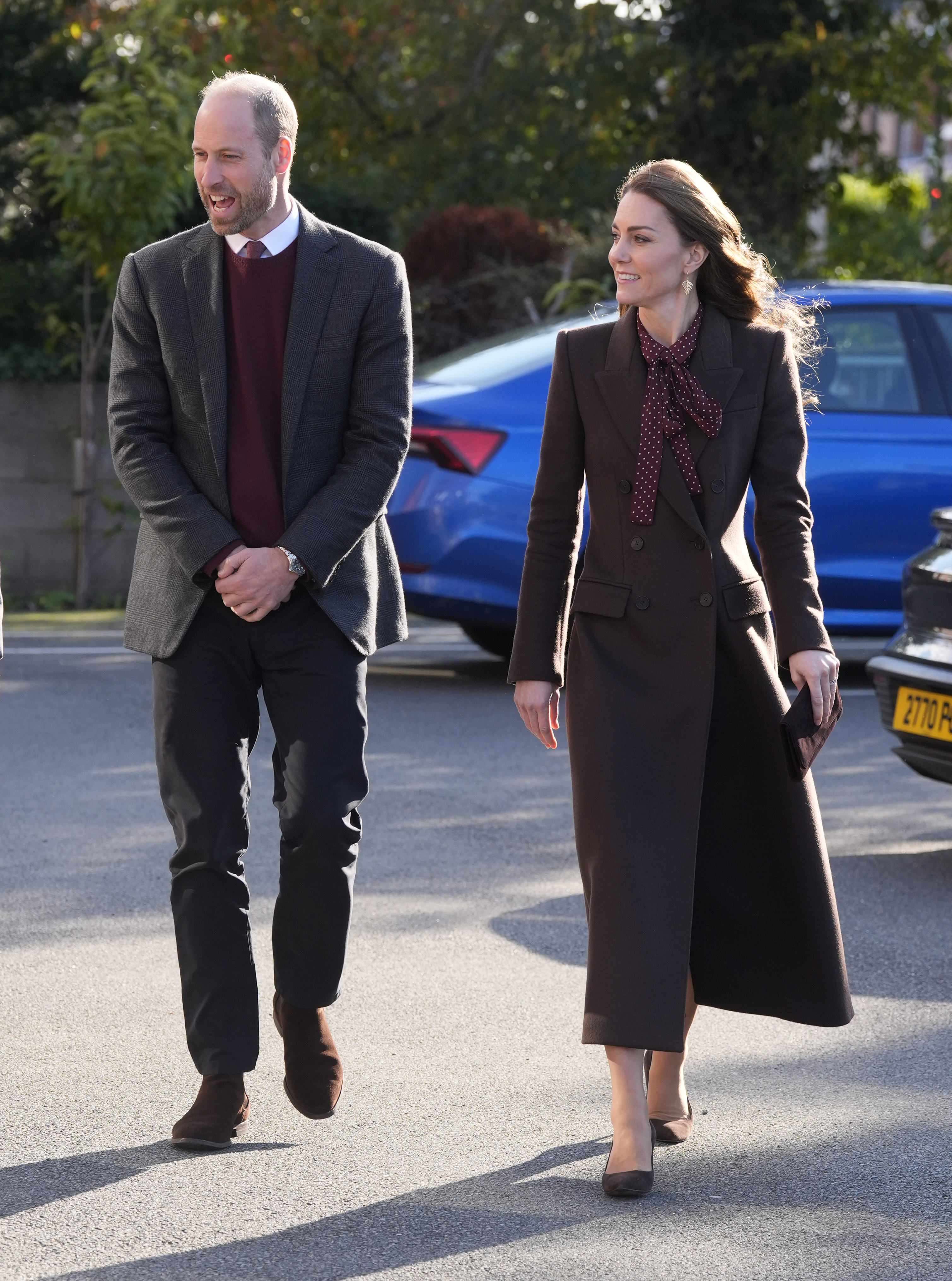 Vilmos herceg egy sötétbordó pulóvert viselt, amely tökéletesen harmonizált felesége összeállításával. A herceg öltözéke egy bordó pulóverből, egy sötétszürke öltönyből és egy barna Chelsea csizmából állt.