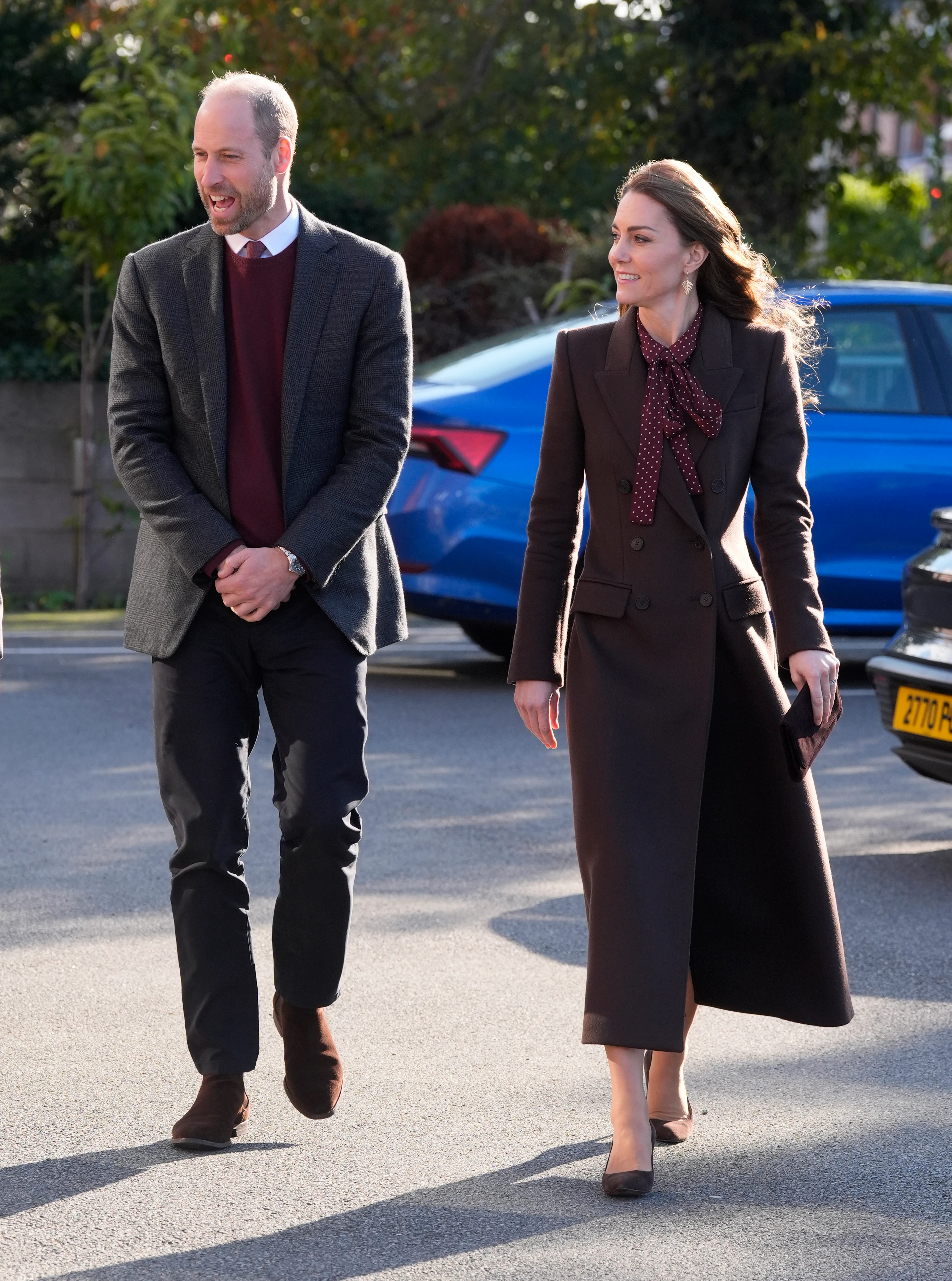 Vilmos herceg egy sötétbordó pulóvert viselt, amely tökéletesen harmonizált felesége összeállításával. A herceg öltözéke egy bordó pulóverből, egy sötétszürke öltönyből és egy barna Chelsea csizmából állt.
