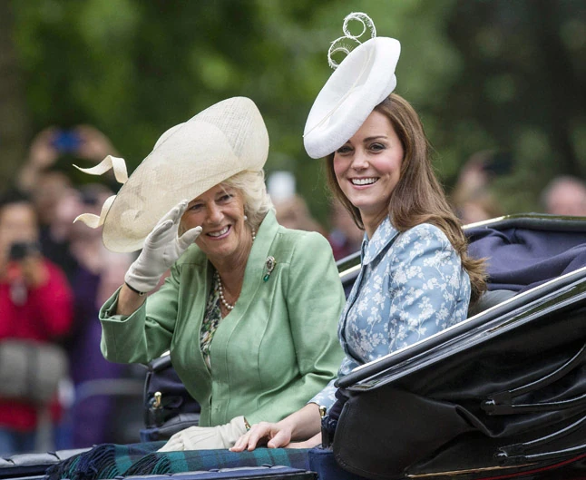 A 33 éves Kate Middleton egy elegáns, világoskék alapon fehér virágmintás Catherine Walker által tervezett kabátban lovas kocsizta körbe Londont Kamilla hercegnő társaságában, és szettjéhez – ahogy azt az angol királyi etikett megköveteli – egy látványos fehér kalapot is viselt.