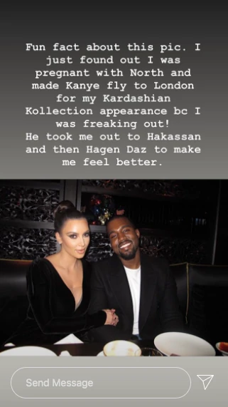 A médiasztár éppen Londonban volt a testvéreivel közös Kardashian Kollection egyik ottani rendezvénye miatt, amikor kiderült, hogy babát vár akkor még csak barátjától, Kanye Westtől. Kim elmesélte, hogy annyira ki volt készülve, hogy megkérte Kanyét, repüljön el hozzá Londonba és nyugtassa meg. A rapper természetesen eleget tett várandós szerelme kérésének, és azon az estén elvitte vacsorázni, majd fagyizni, hogy jobban érezze magát. Mindez 2012-ben történt, North születése előtt.